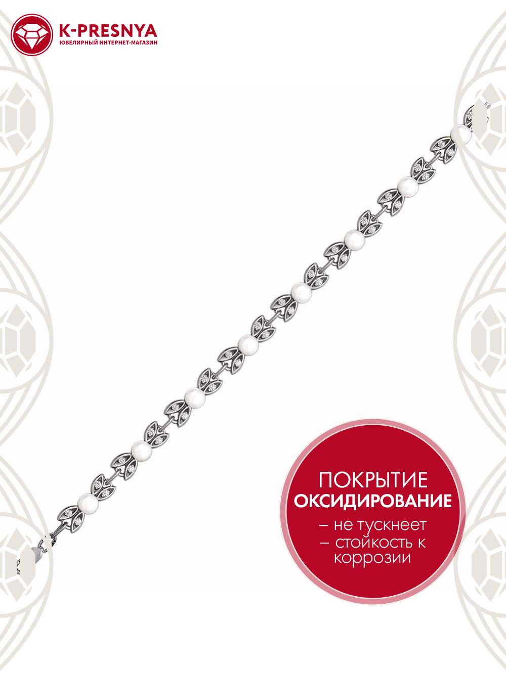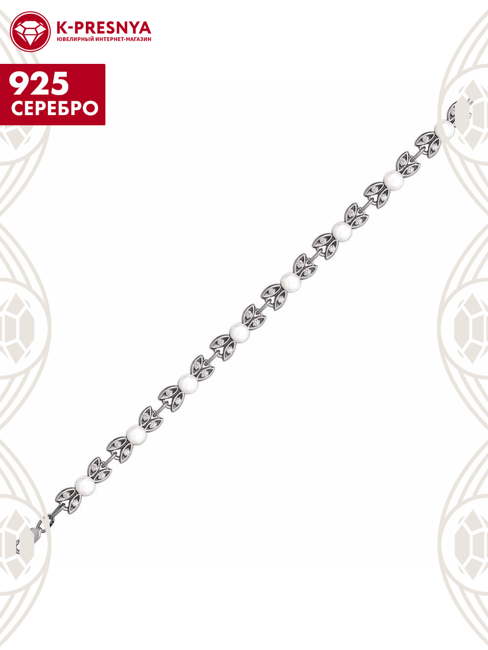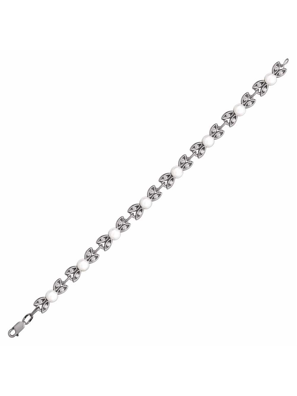 Браслет серебро 925 пробы, покрытие - оксидирование, вставка - культивированный жемчуг, фианит (недрагоценный камень)