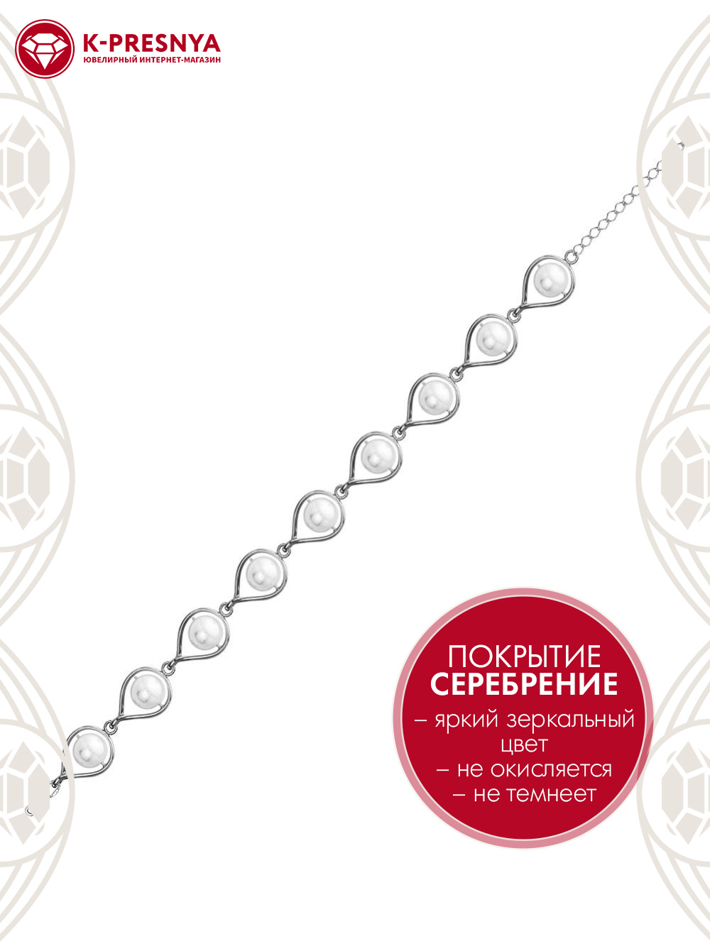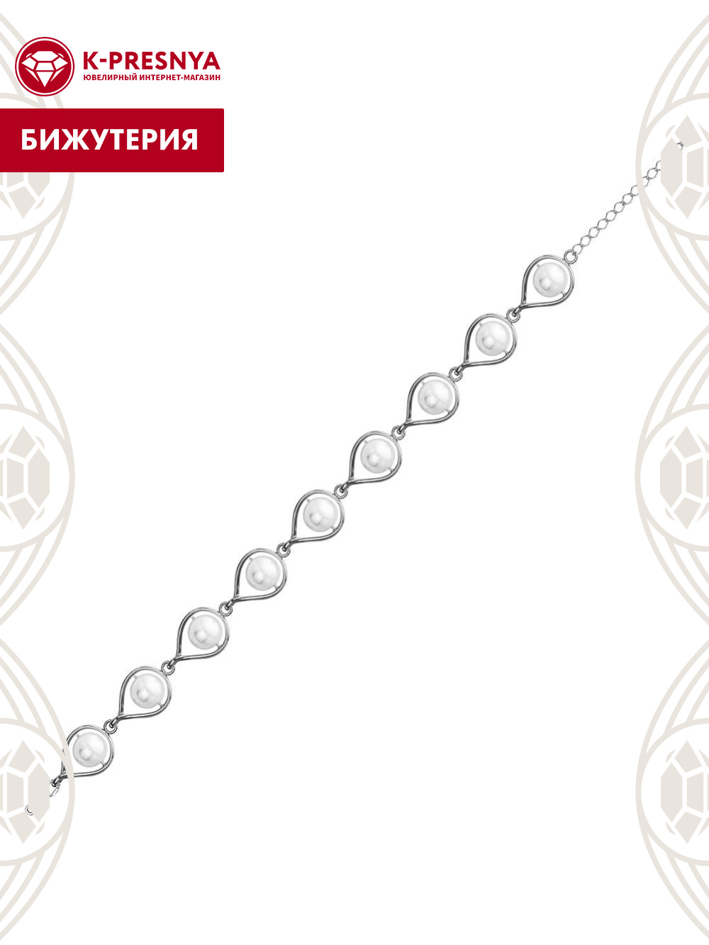 Браслет бижутерия, покрытие - серебрение с оксидированием, вставка - имитация жемчуга