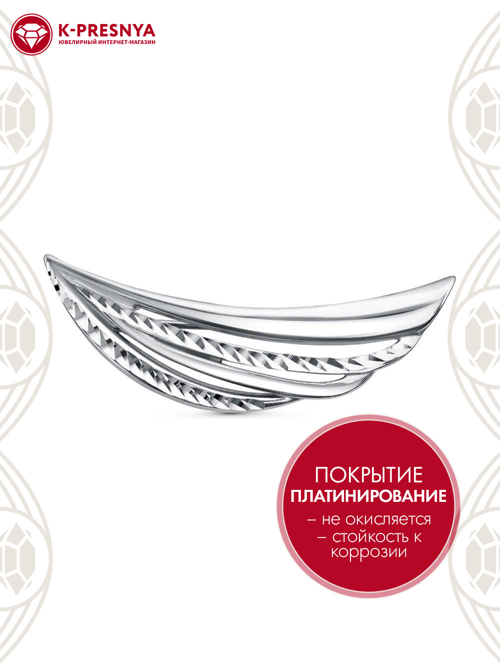 Брошь серебро 925 пробы, покрытие - платинирование, отделка - алмазная грань, без вставок