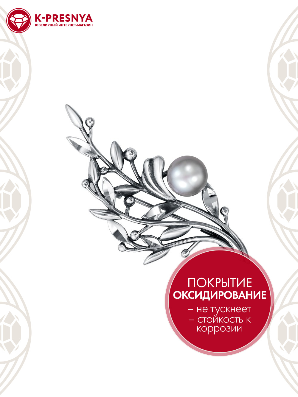 Брошь серебро 925 пробы, покрытие - оксидирование, отделка - алмазная грань, вставка - культивированный жемчуг