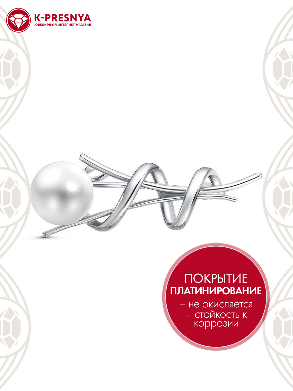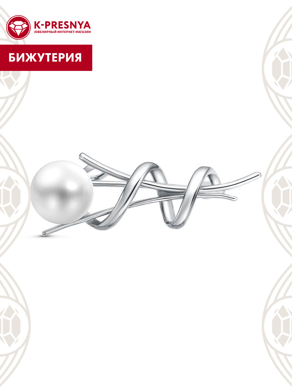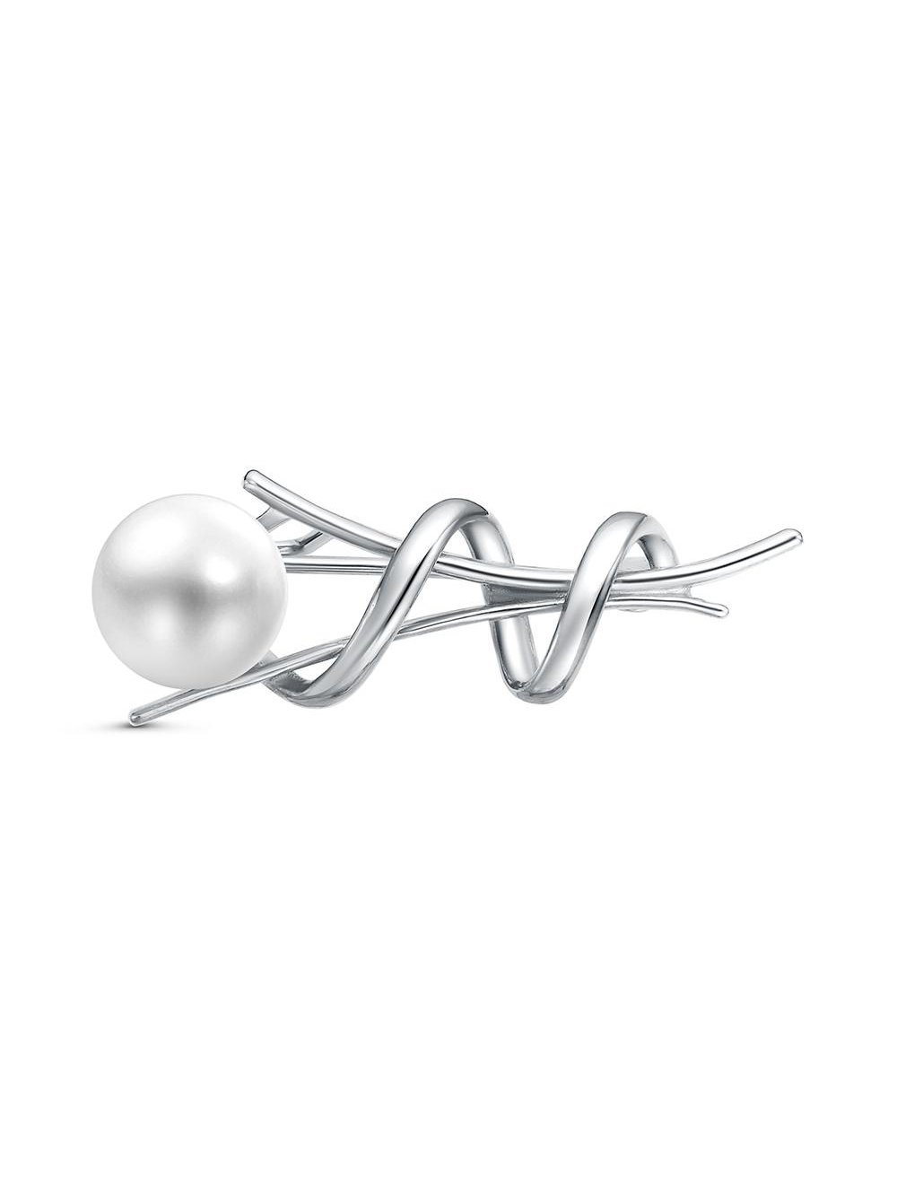 Брошь бижутерия, покрытие - платинирование, вставка - культивированный жемчуг