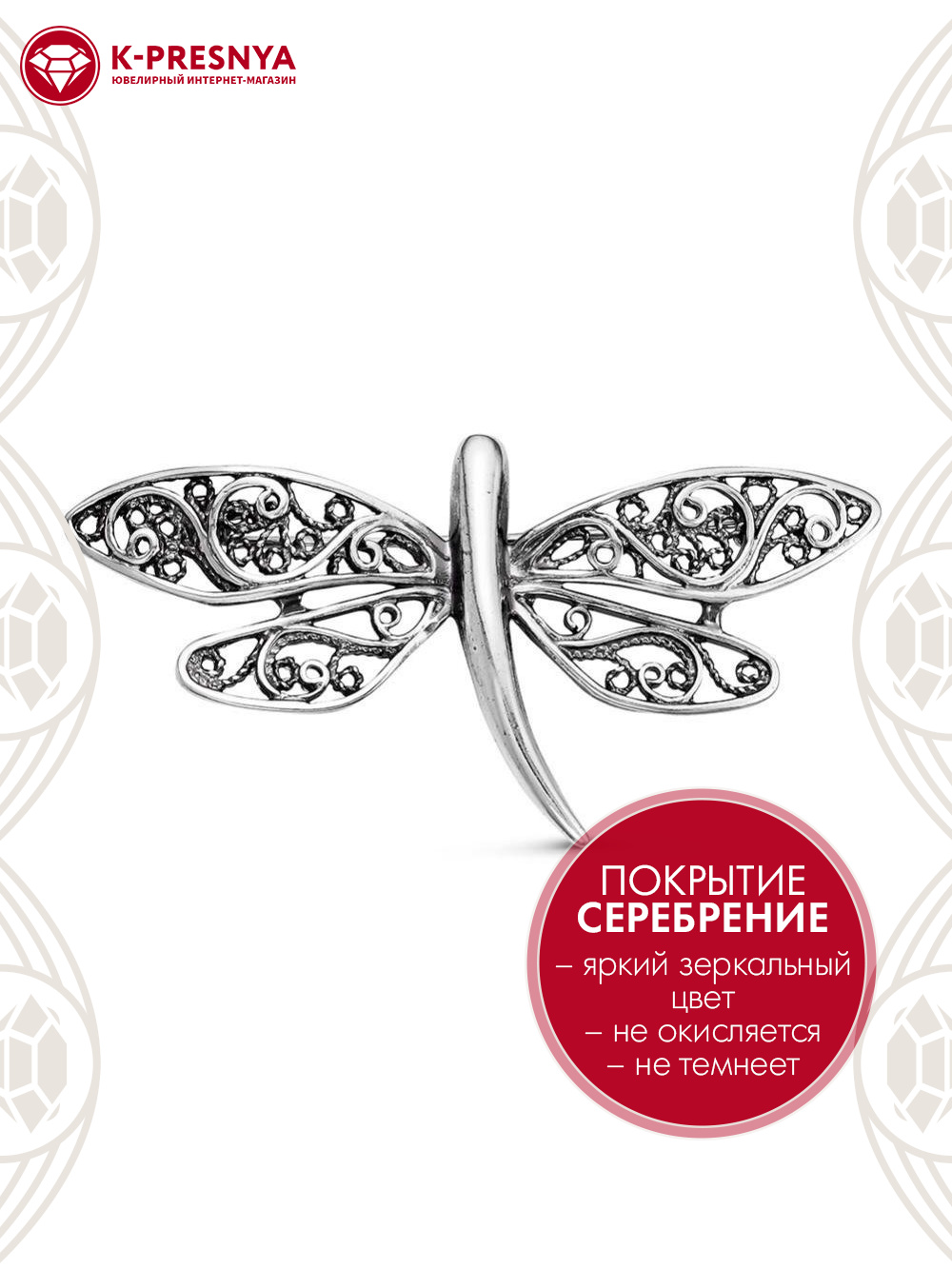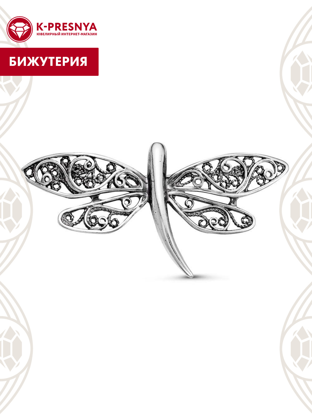 Брошь бижутерия, покрытие - серебрение с оксидированием, без вставок