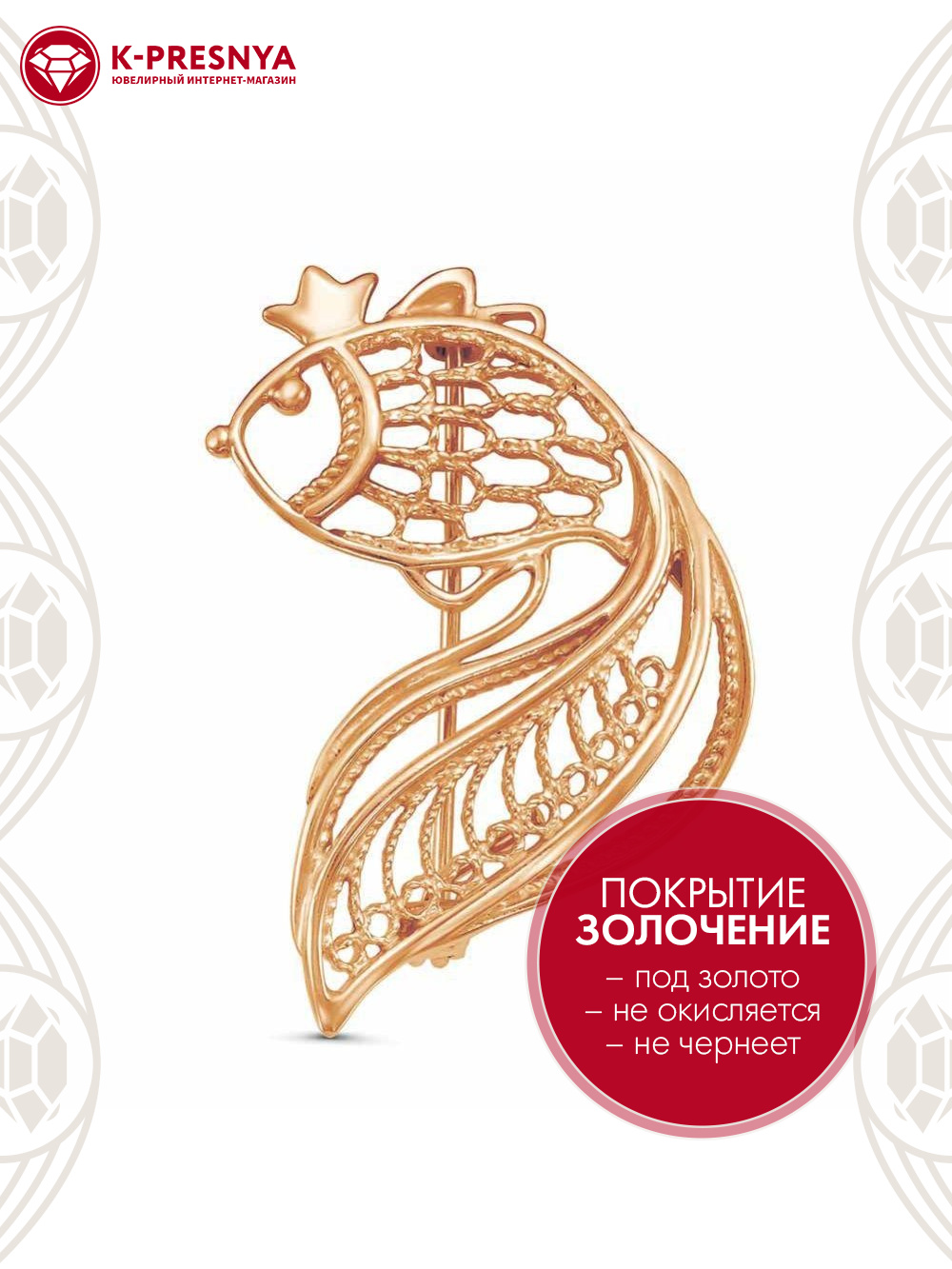 Брошь бижутерия, покрытие - золочение, без вставок