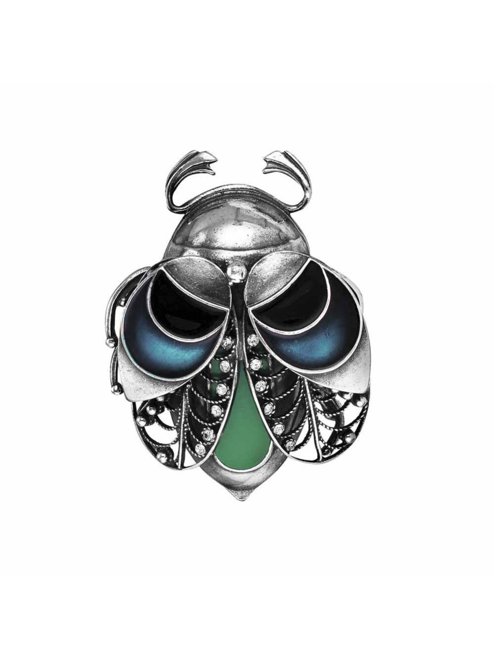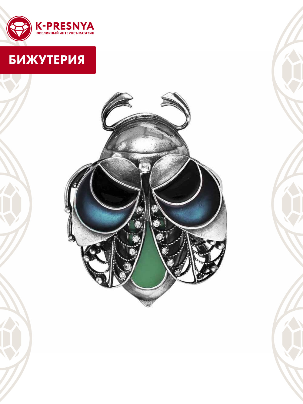 Брошь бижутерия, покрытие - серебрение с оксидированием, отделка - эмаль, вставка - стекло ювелирное preciosa