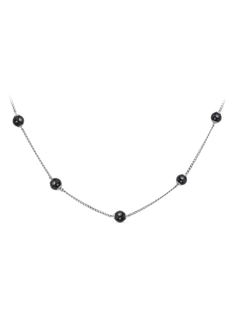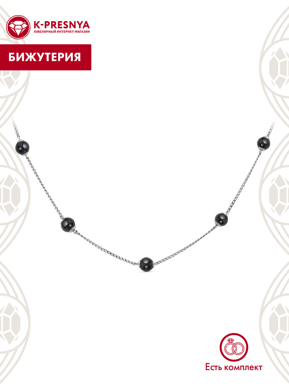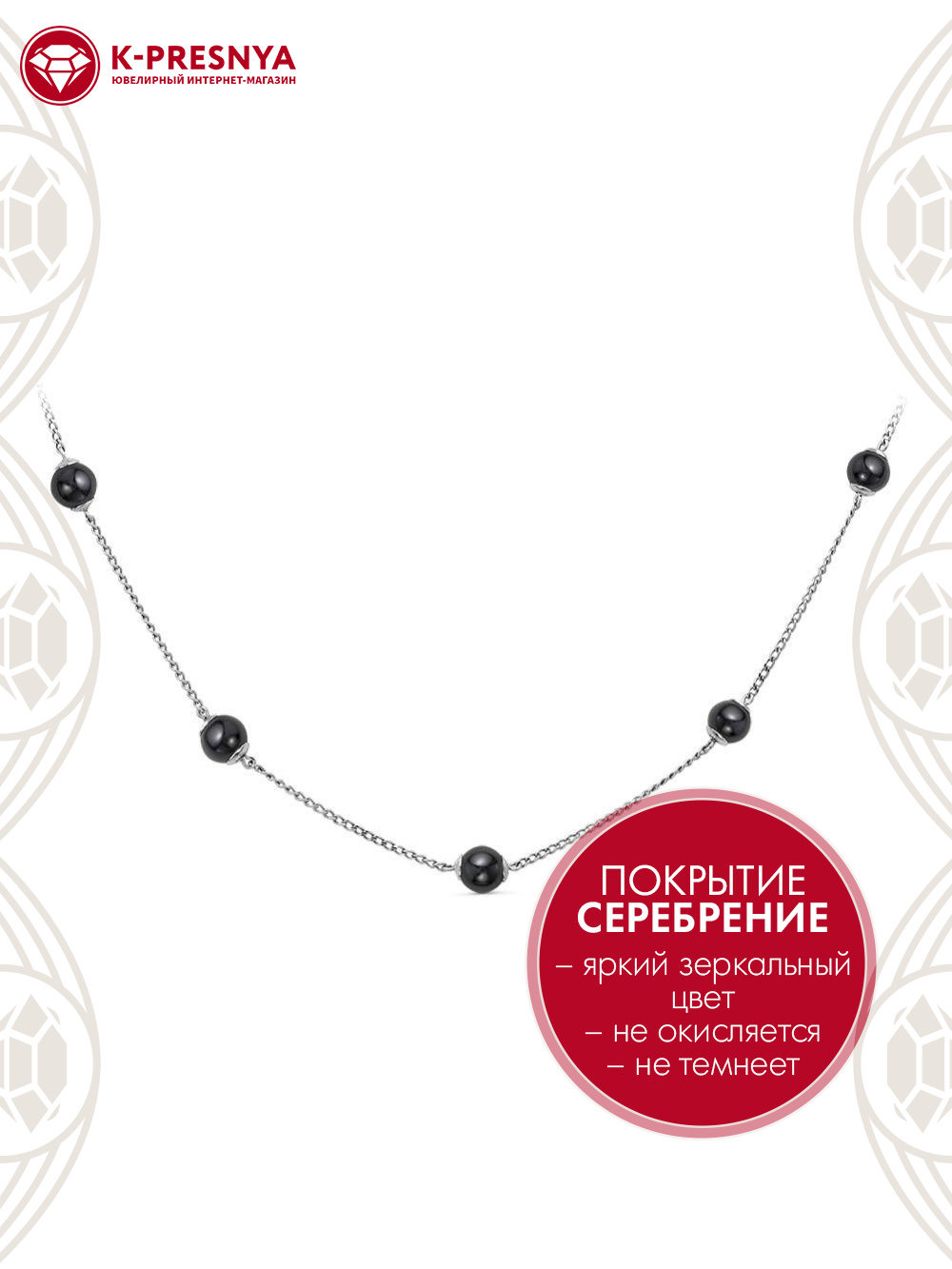Колье бижутерия, покрытие - серебрение, вставка - гематит