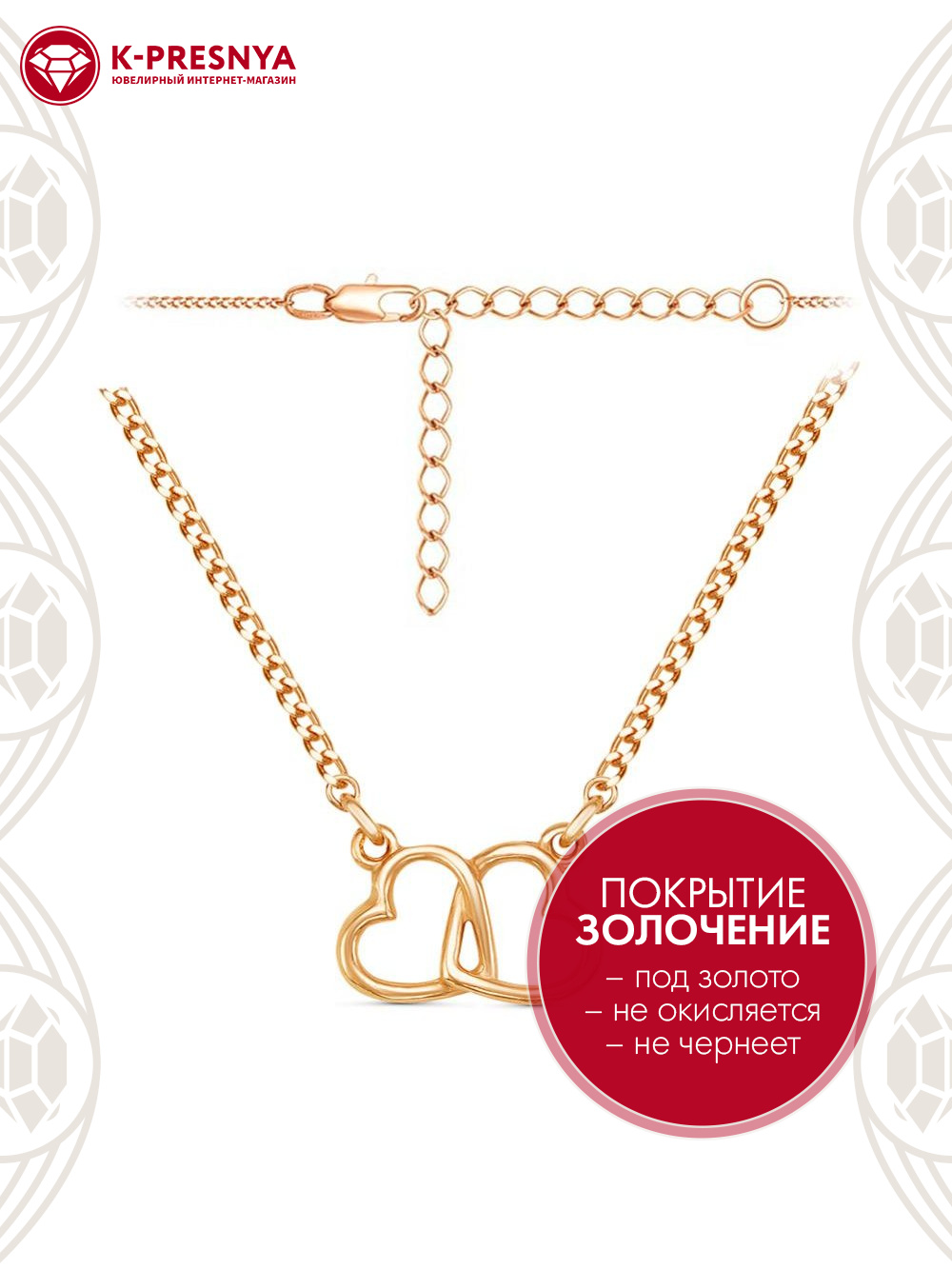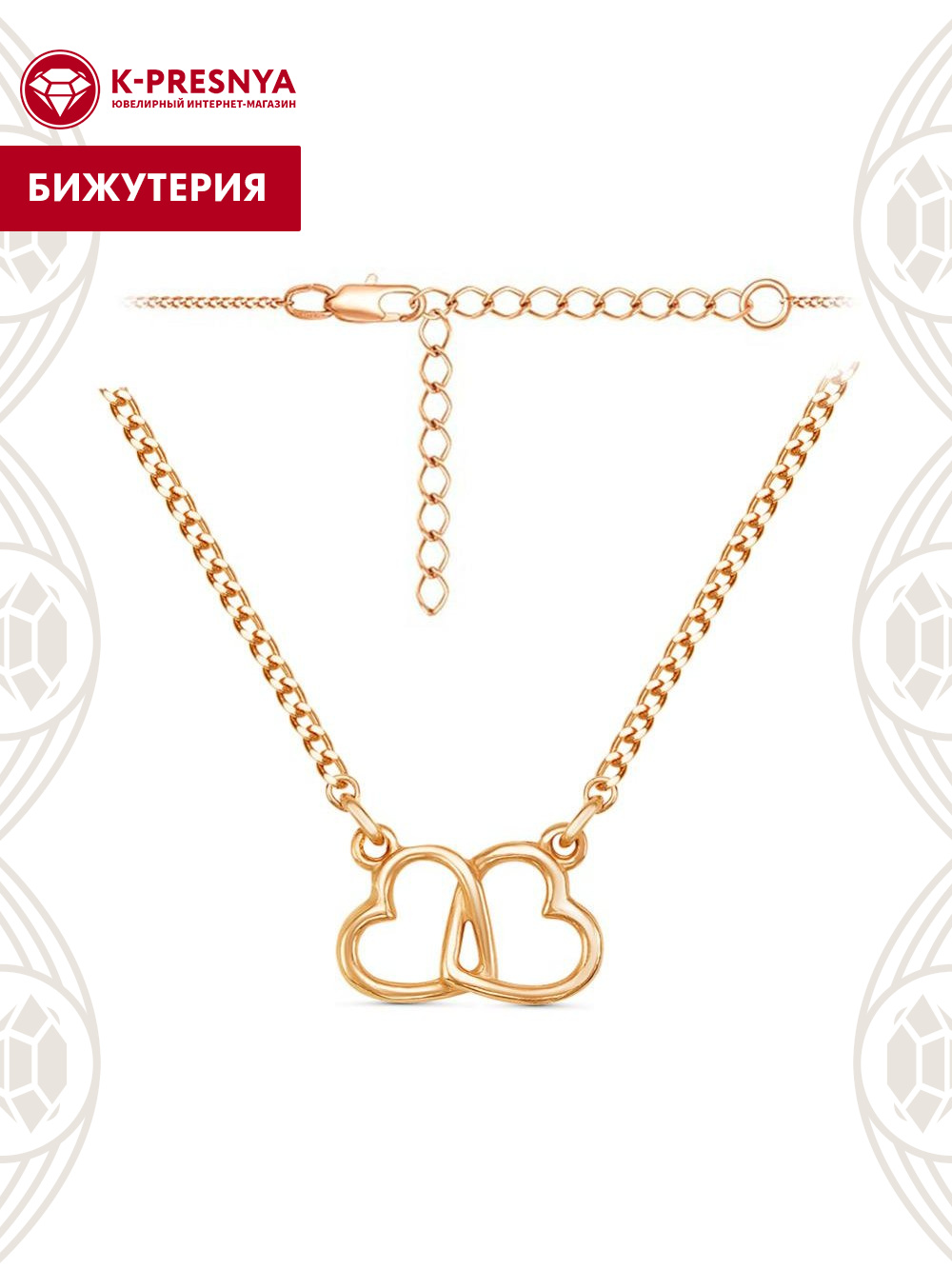 Колье "Два сердца" с дополнительной цепочкой 50 мм, которая позволяет регулировать размер