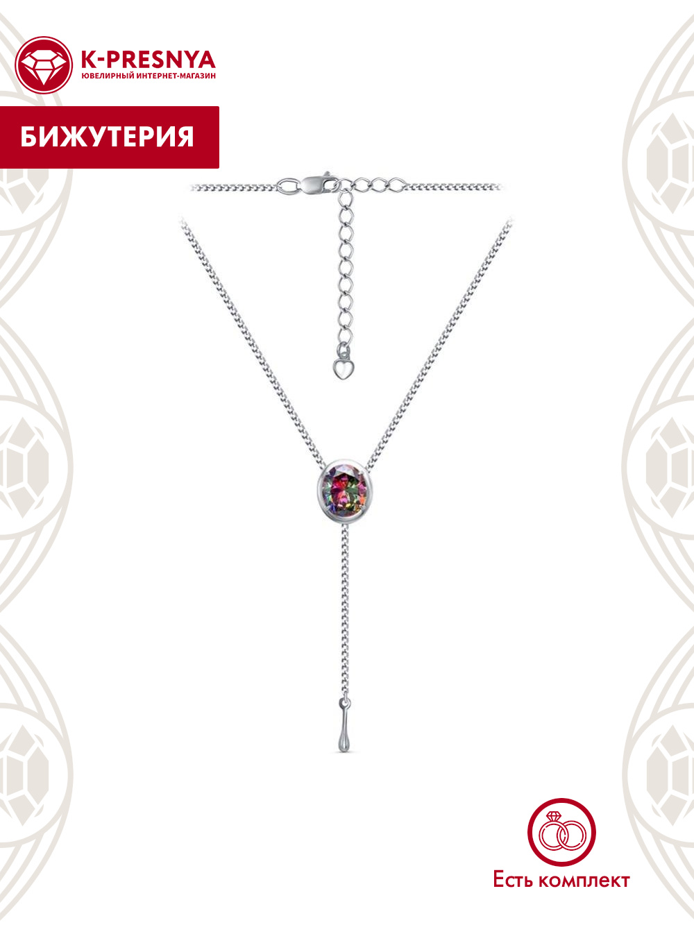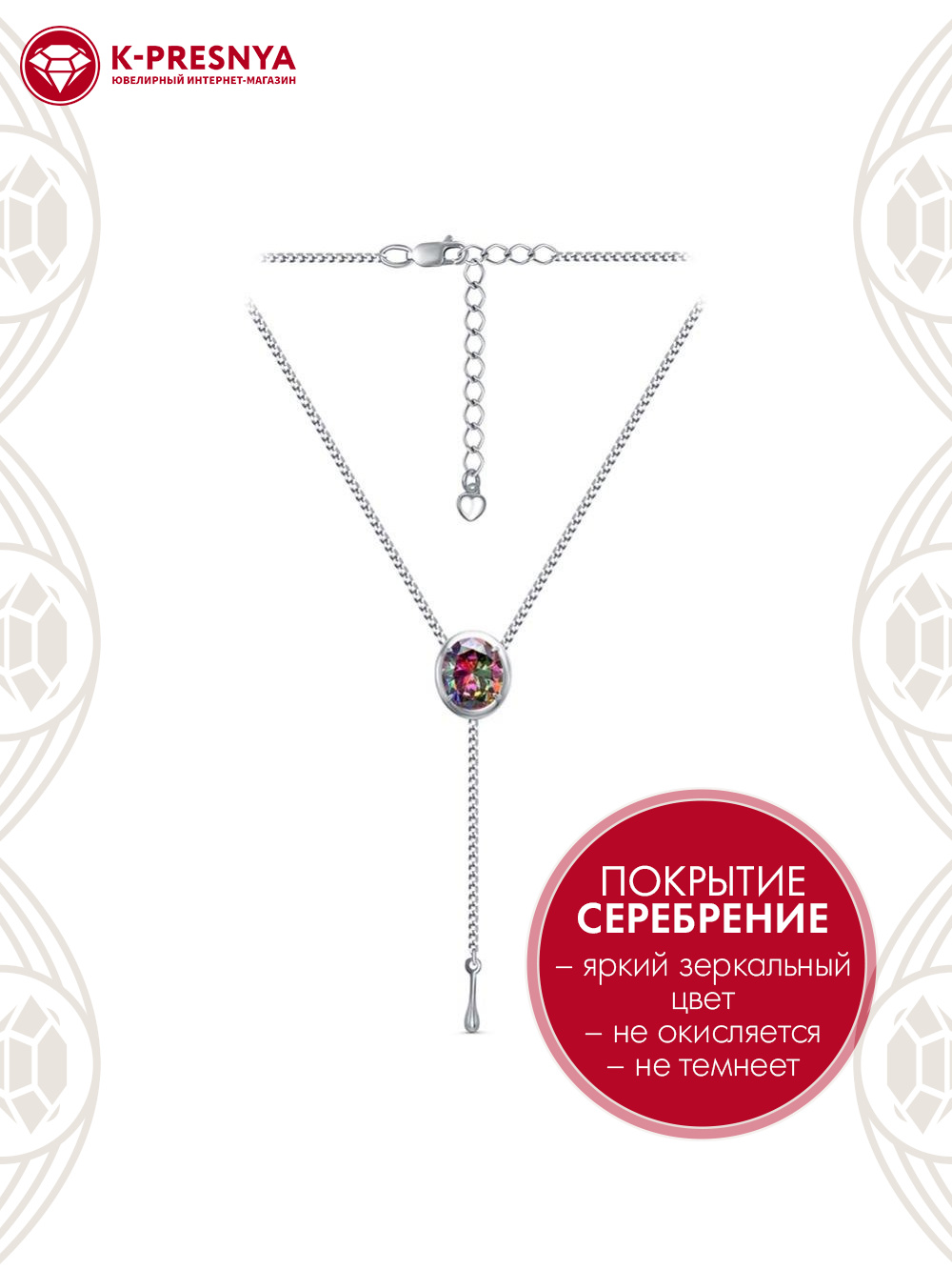 Колье бижутерия, покрытие - серебрение, вставка - фианит (недрагоценный камень)