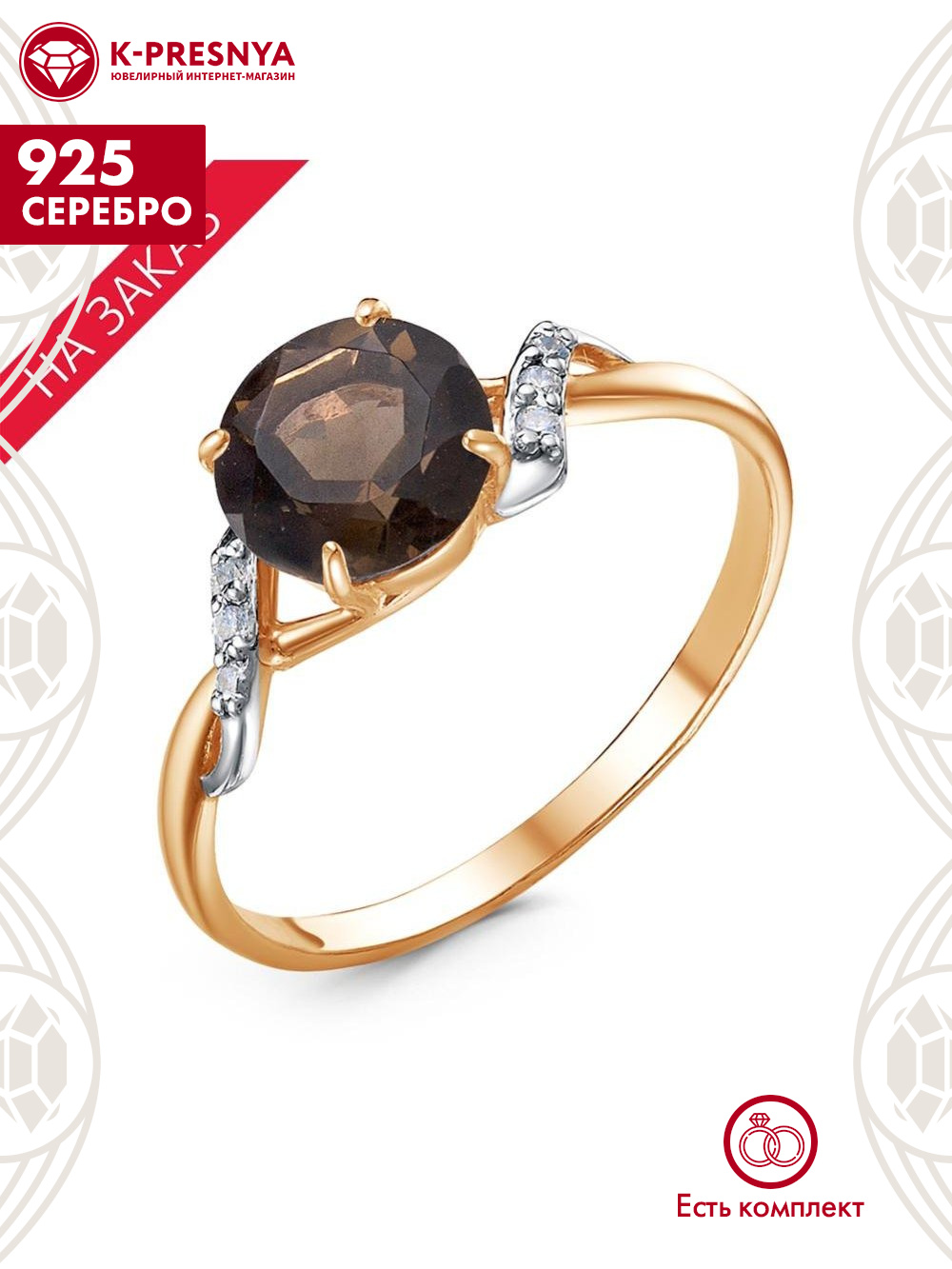 Кольцо серебро 925 пробы, покрытие - золочение, выборочное родирование, вставка - дымчатый кварц, фианит (недрагоценный камень)