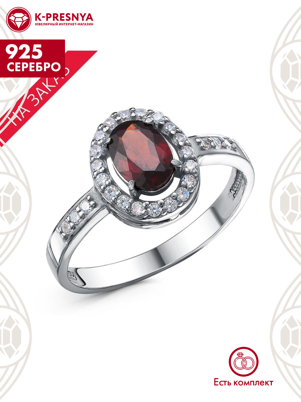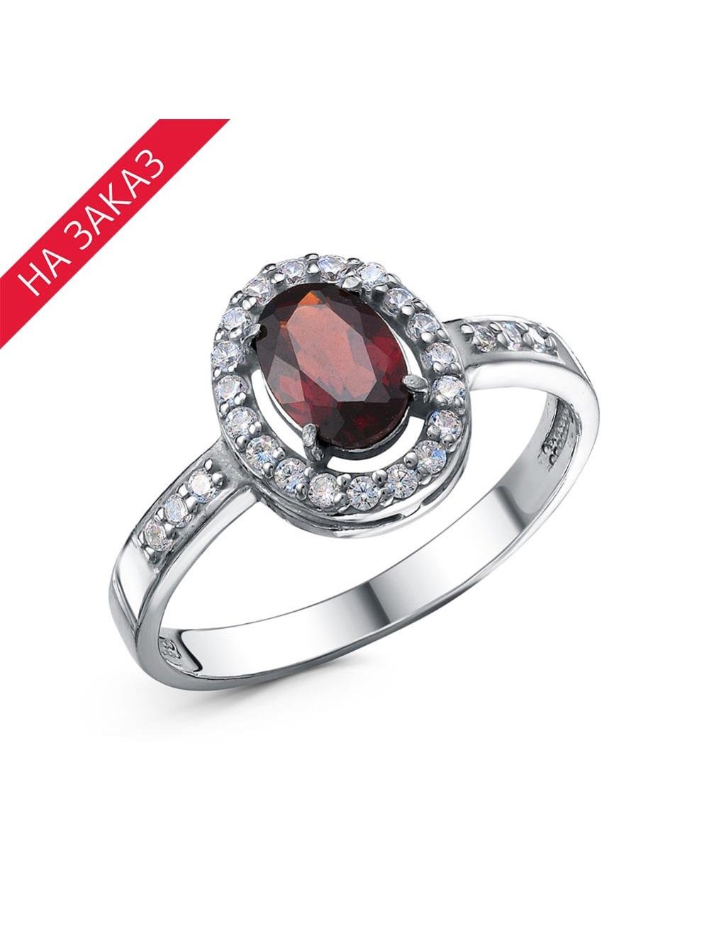 Кольцо серебро 925 пробы, покрытие - родирование, вставка - гранат (полудрагоценный камень), фианит (недрагоценный камень)
