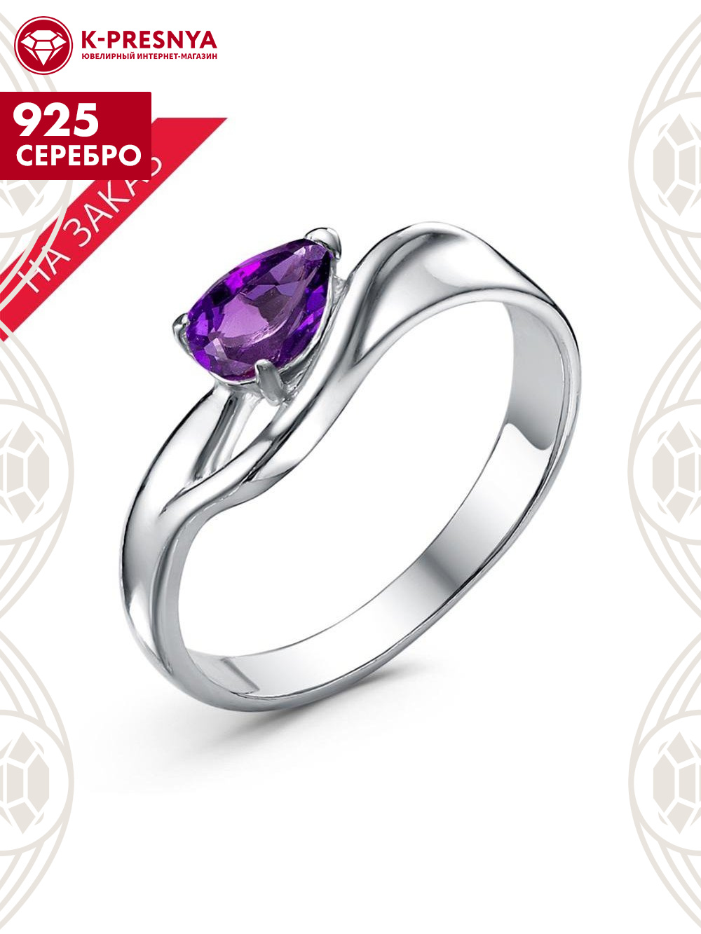 Кольцо серебро 925 пробы, покрытие - родирование, вставка - аметист (полудрагоценный камень)