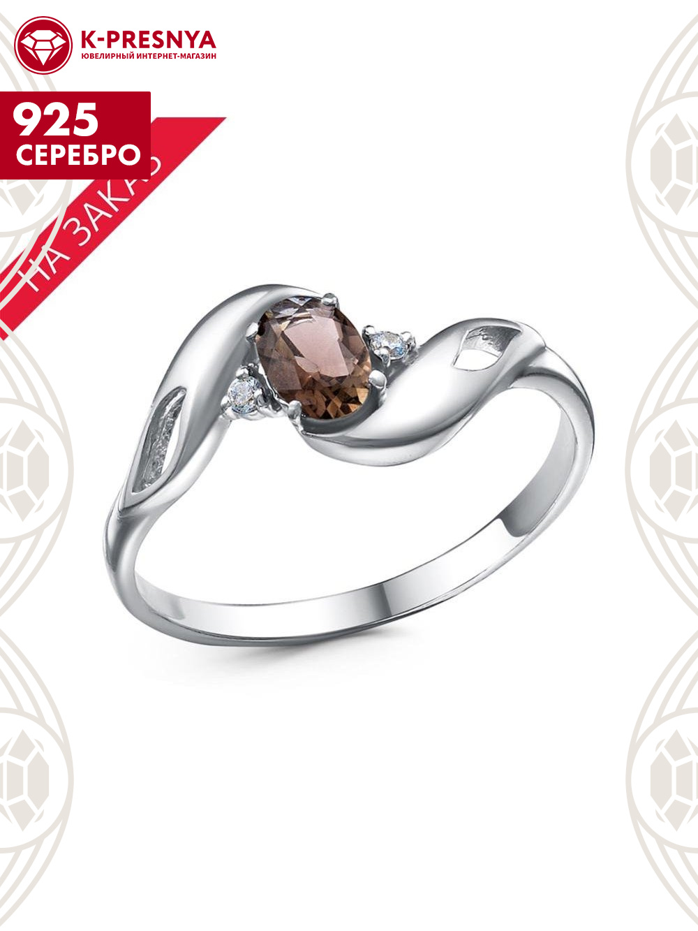 Кольцо серебро 925 пробы, покрытие - родирование, вставка - дымчатый кварц, фианит (недрагоценный камень)