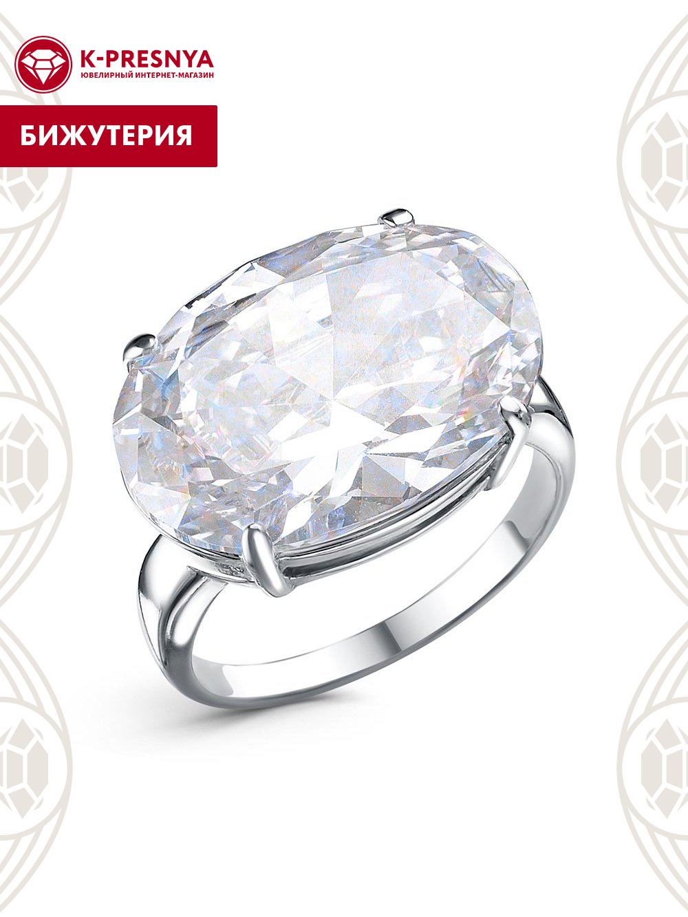 Кольцо бижутерия, покрытие - платинирование, вставка - фианит (недрагоценный камень)