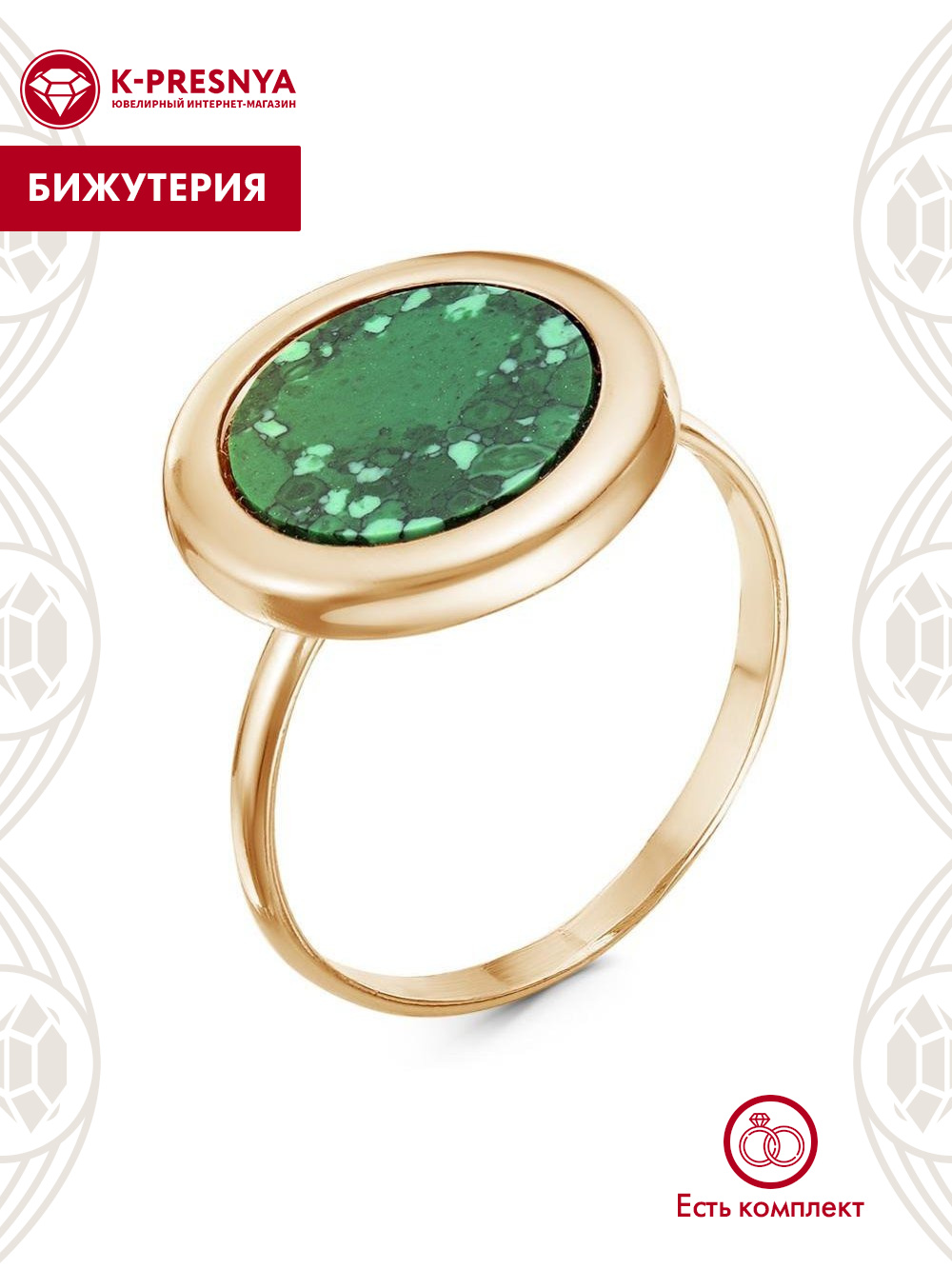 Кольцо бижутерия, покрытие - золочение, вставка - искусственный малахит