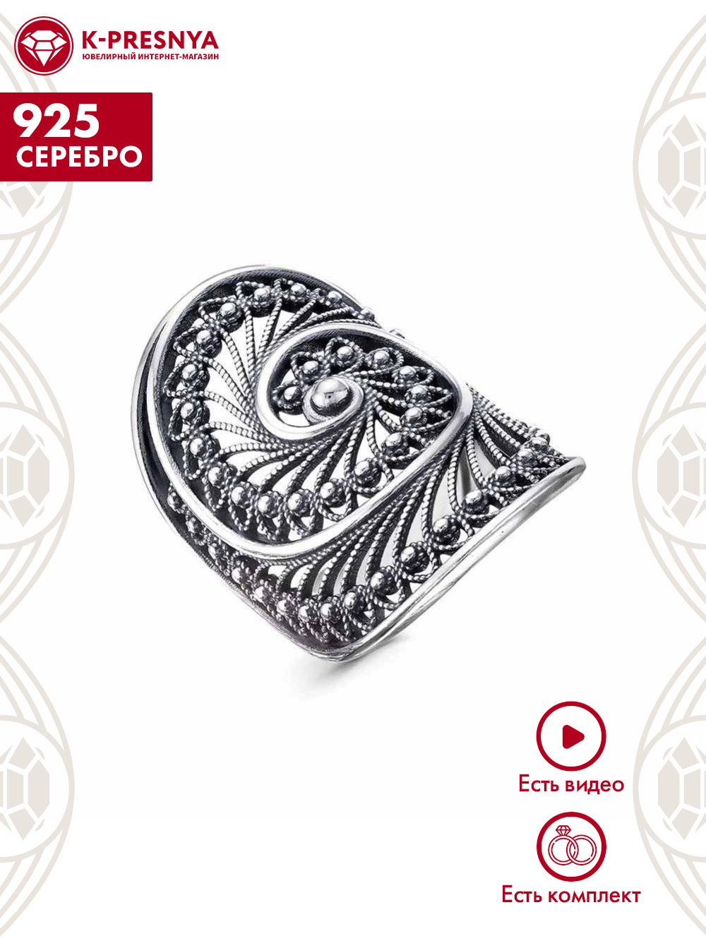Кольцо серебро 925 пробы, покрытие - оксидирование, без вставок