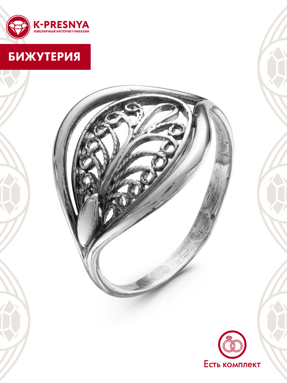 Кольцо бижутерия, покрытие - серебрение с оксидированием, без вставок