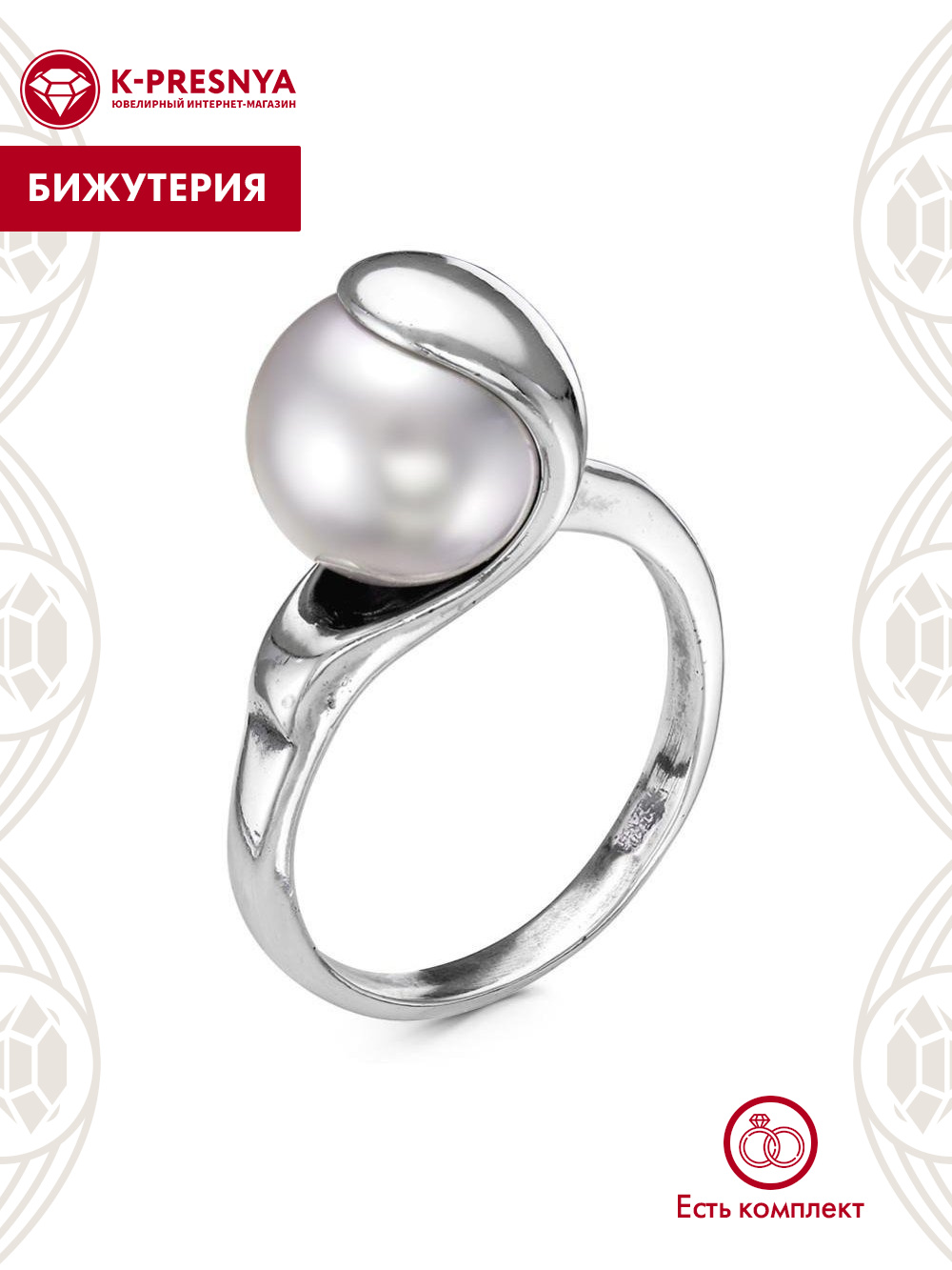 Кольцо бижутерия, покрытие - серебрение с оксидированием, вставка - имитация жемчуга