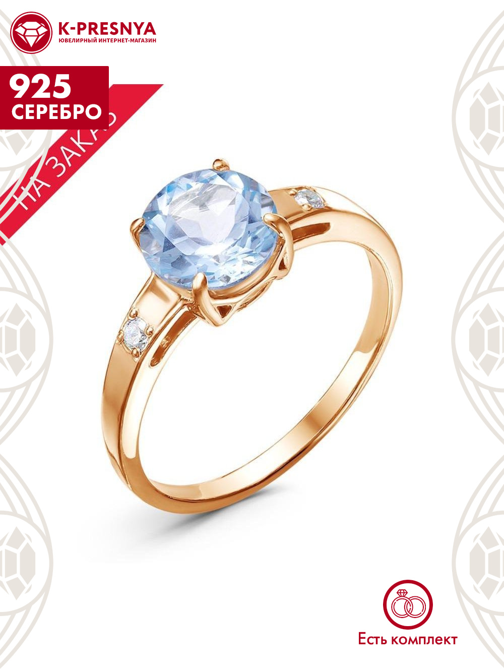 Кольцо серебро 925 пробы, покрытие - золочение, вставка - голубой топаз (полудрагоценный камень), фианит (недрагоценный камень)