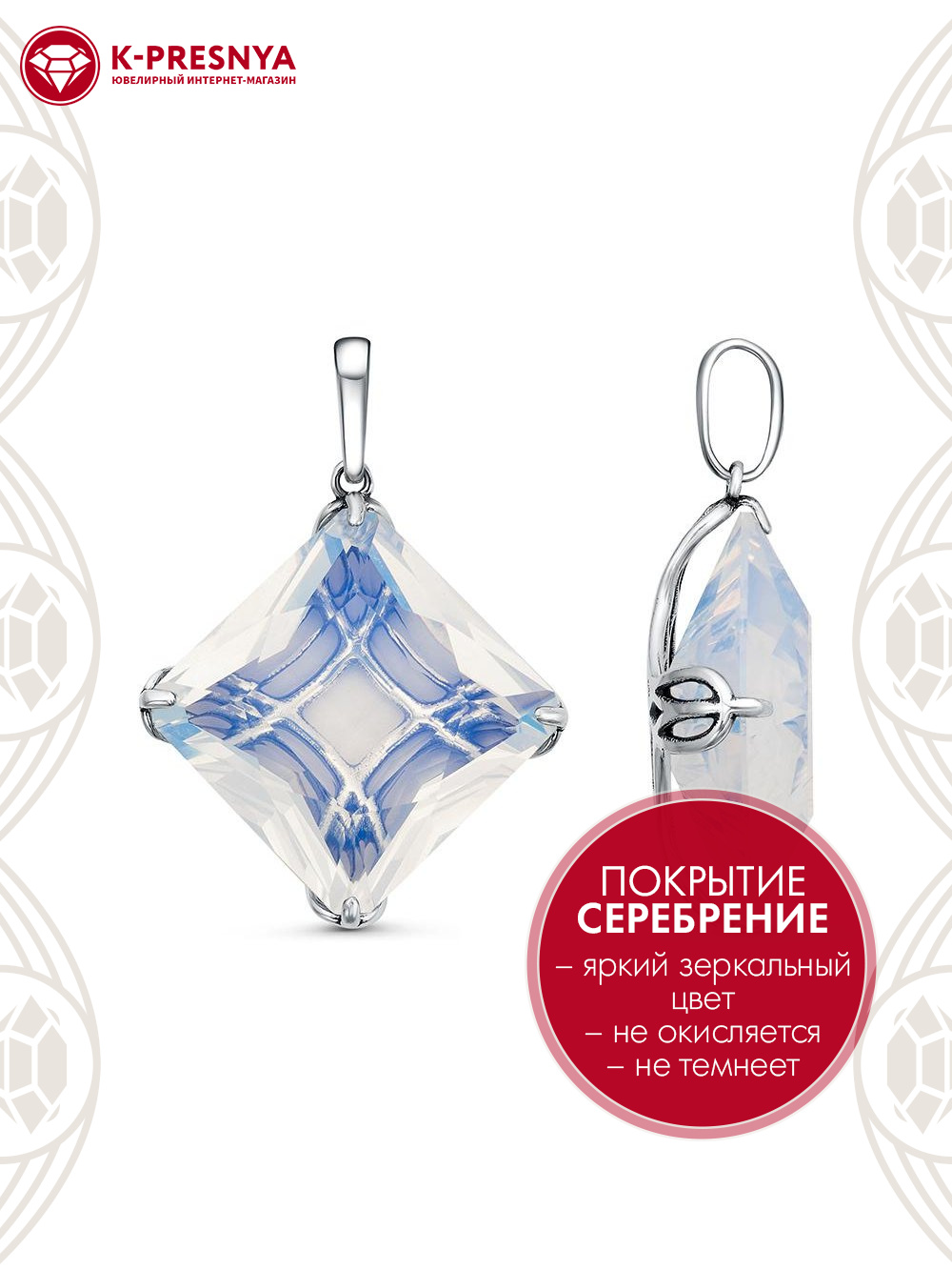 Подвеска бижутерия, покрытие - серебрение с оксидированием, вставка - стекло ювелирное собственной огранки
