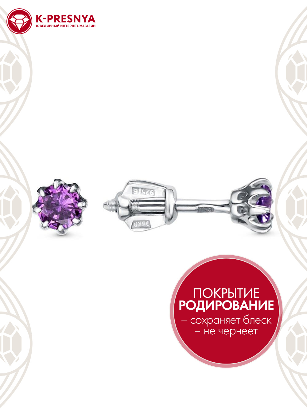 Серьги серебро 925 пробы, покрытие - родирование, вставка - фианит (недрагоценный камень)