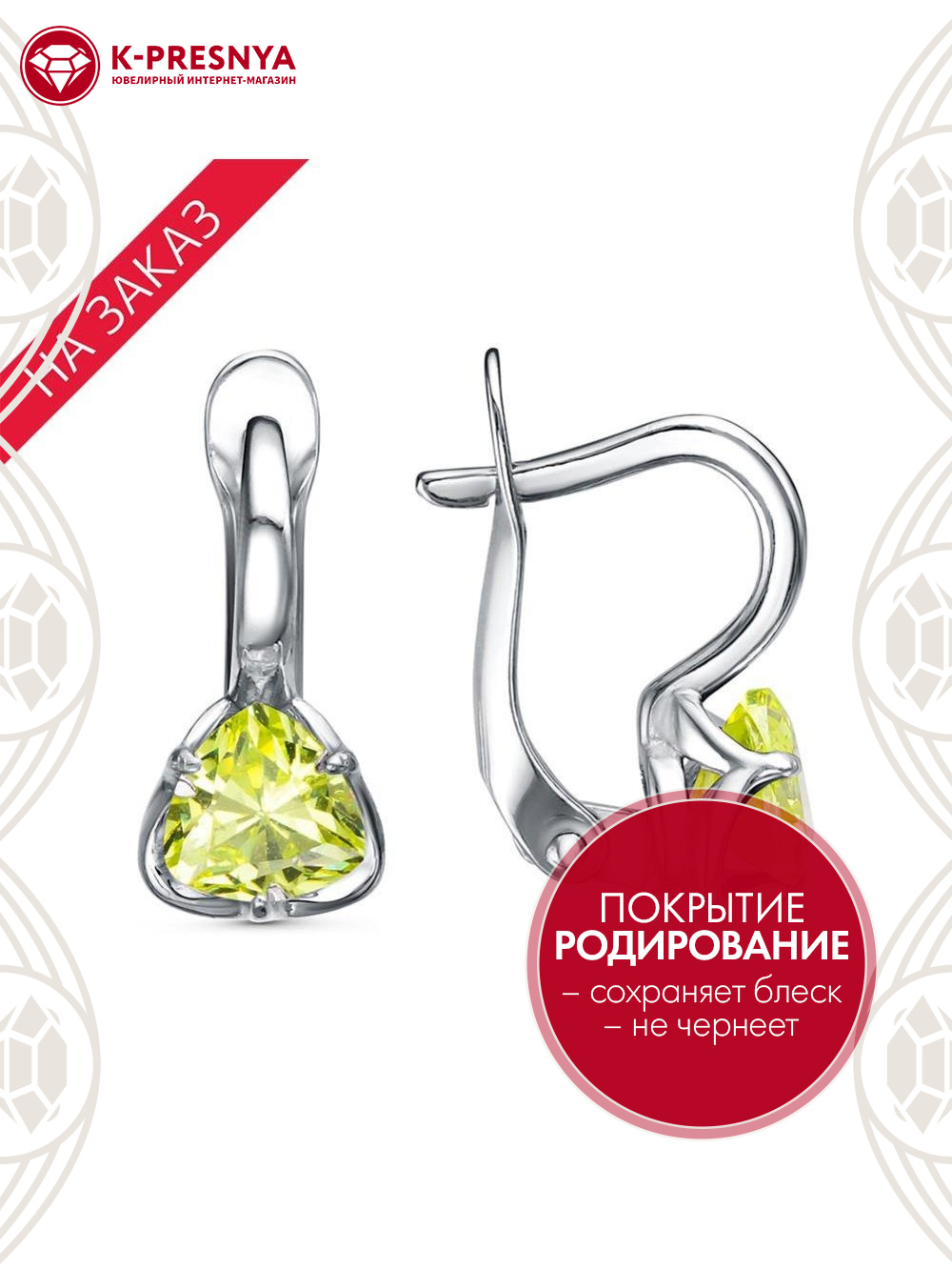 Серьги серебро 925 пробы, покрытие - родирование, вставка - фианит (недрагоценный камень)