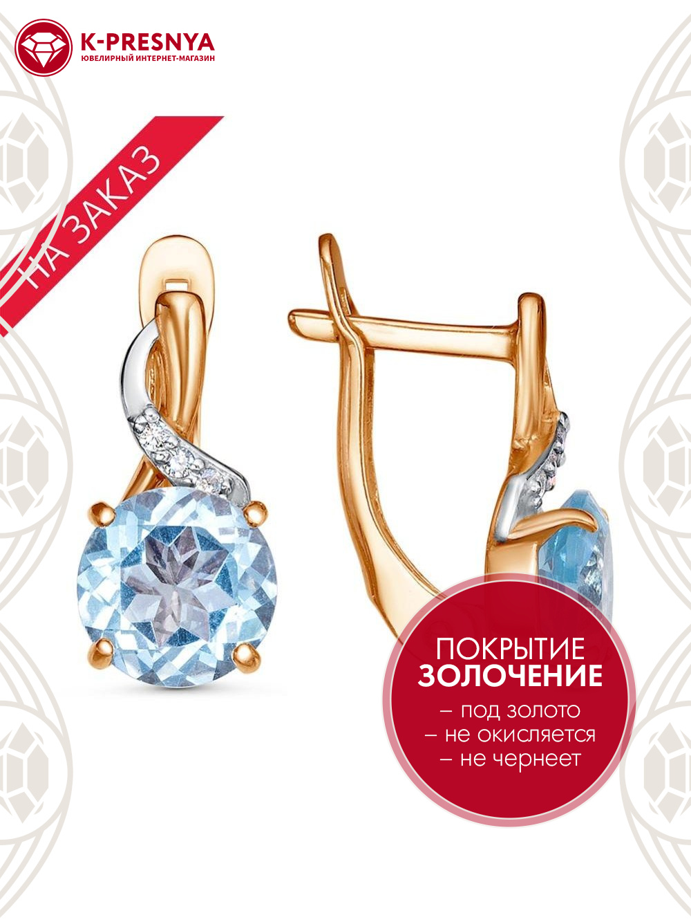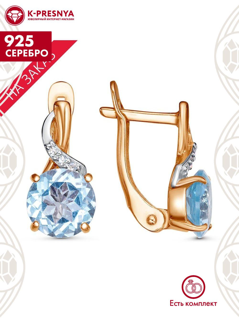 Голубой топаз (полудраг. камень) Круг 2,25ct 8х5мм 2шт; Фианит (недраг. камень) Круг 1,25мм 6шт |
