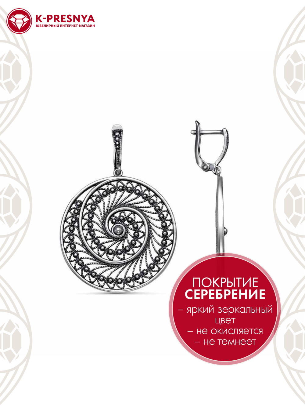 Серьги бижутерия, покрытие - серебрение с оксидированием, без вставок