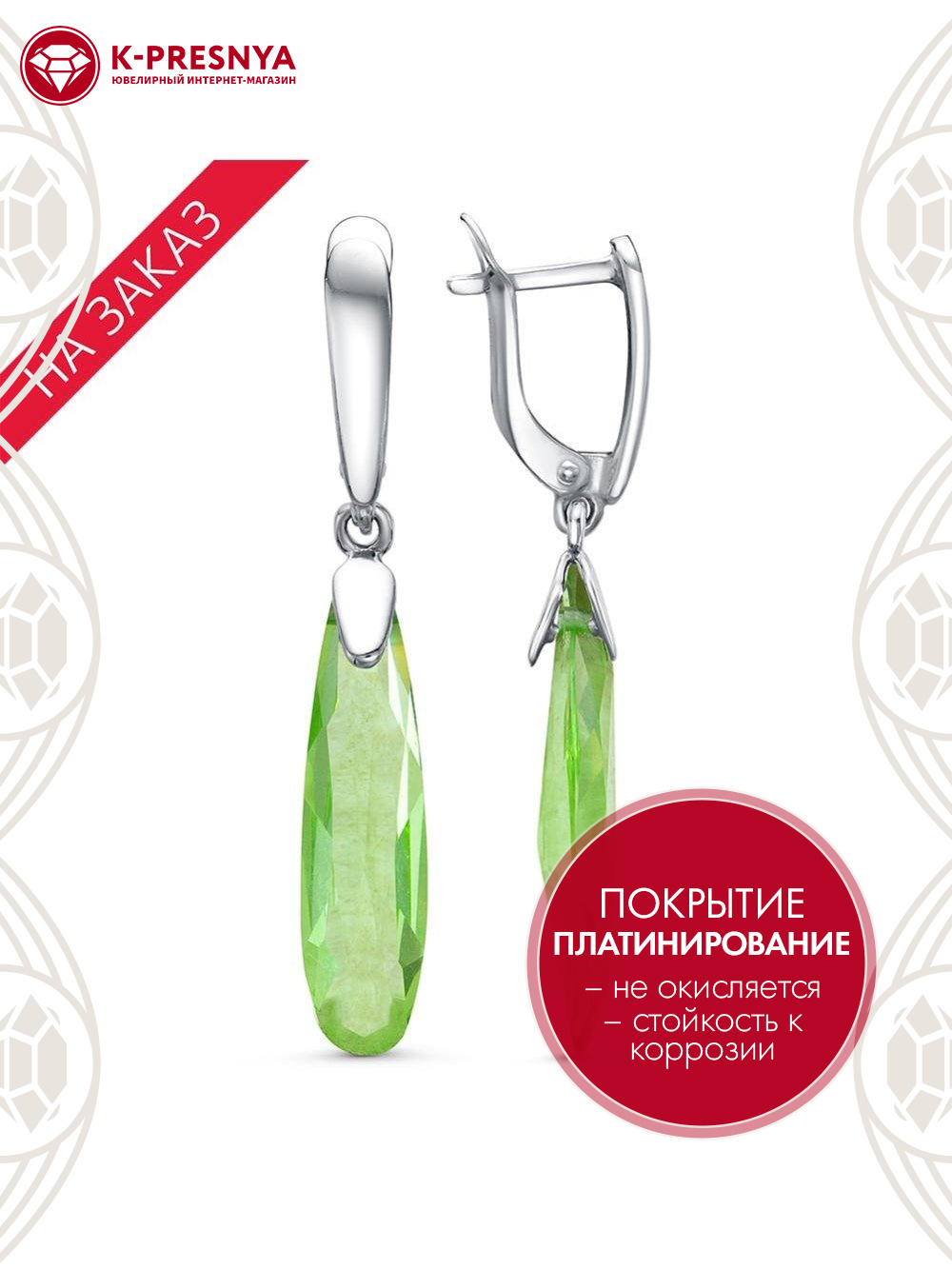Серьги серебро 925 пробы, покрытие - платинирование, вставка - стекло ювелирное собственной огранки