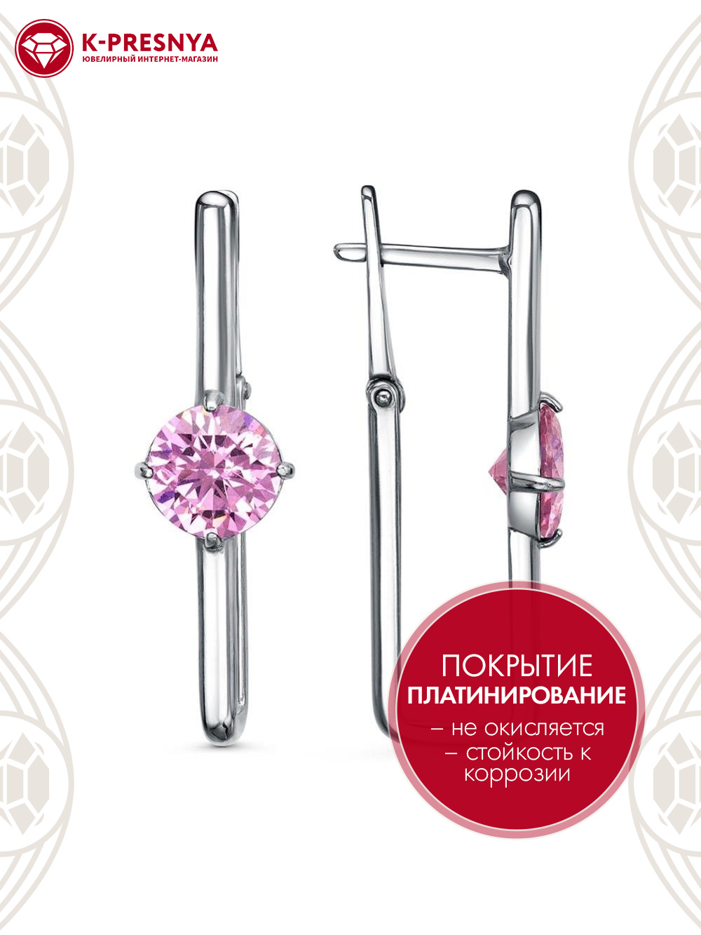 Серьги серебро 925 пробы, покрытие - платинирование, вставка - фианит (недрагоценный камень)