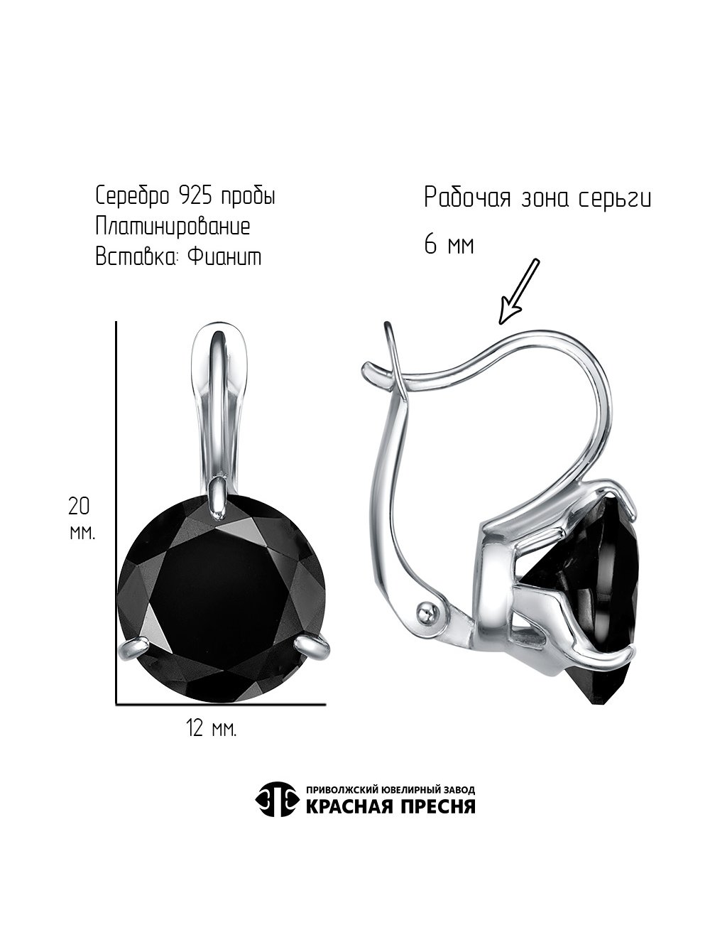 Серьги серебро 925 пробы, покрытие - платинирование, вставка - фианит (недрагоценный камень)