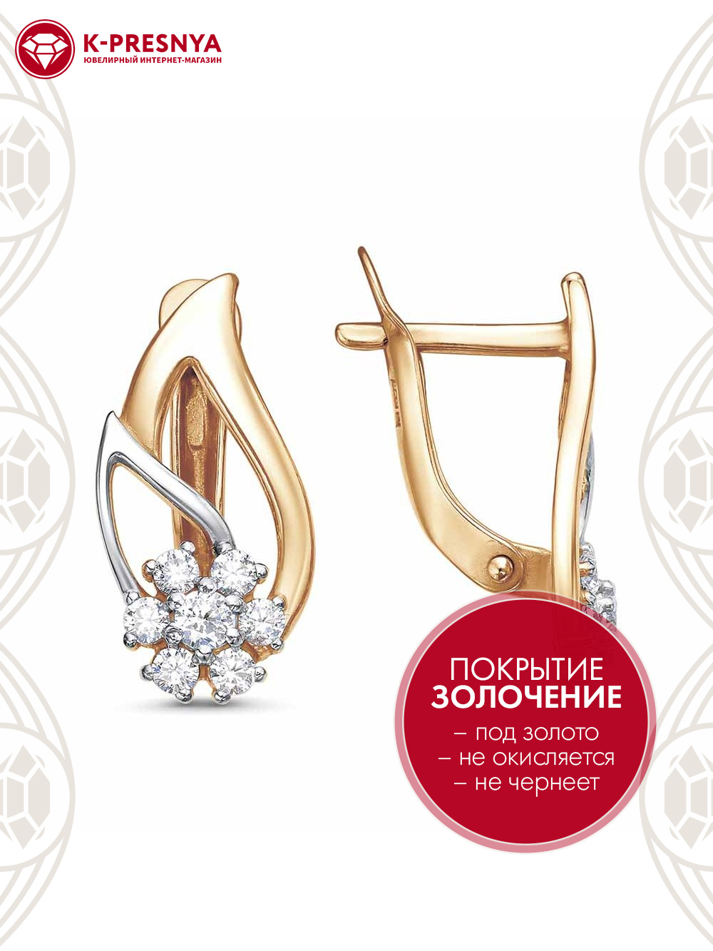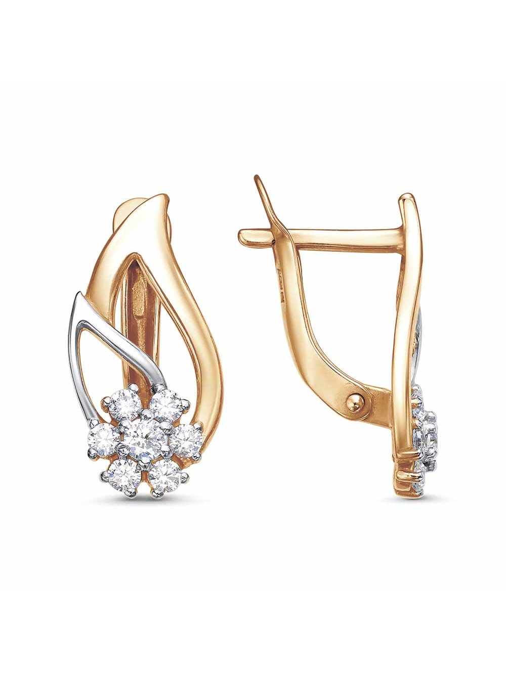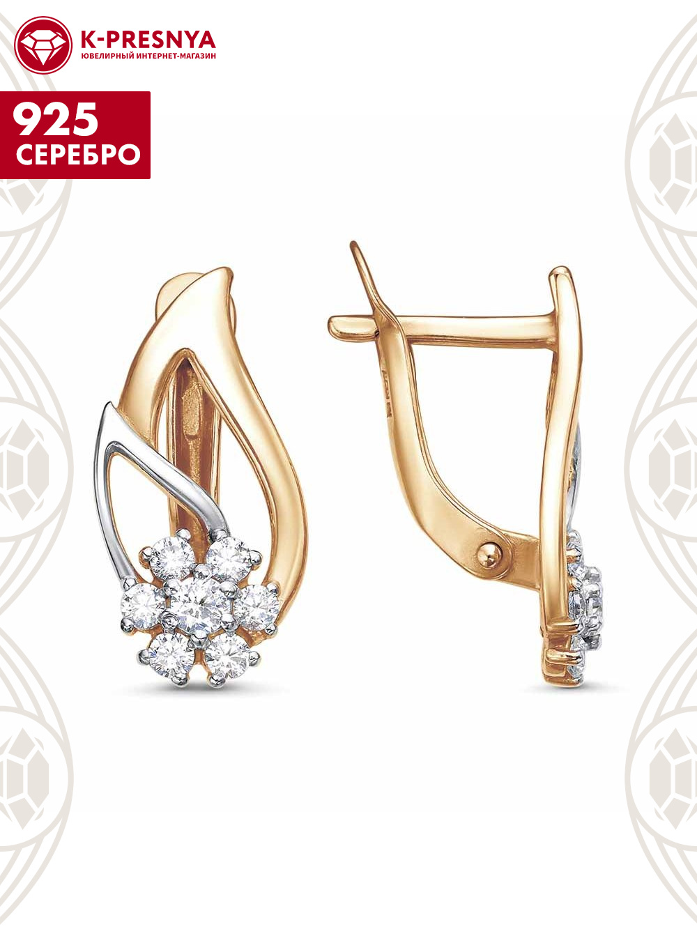Серьги серебро 925 пробы, покрытие - золочение, выборочное родирование, вставка - фианит (недрагоценный камень)
