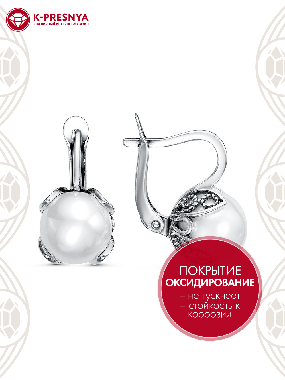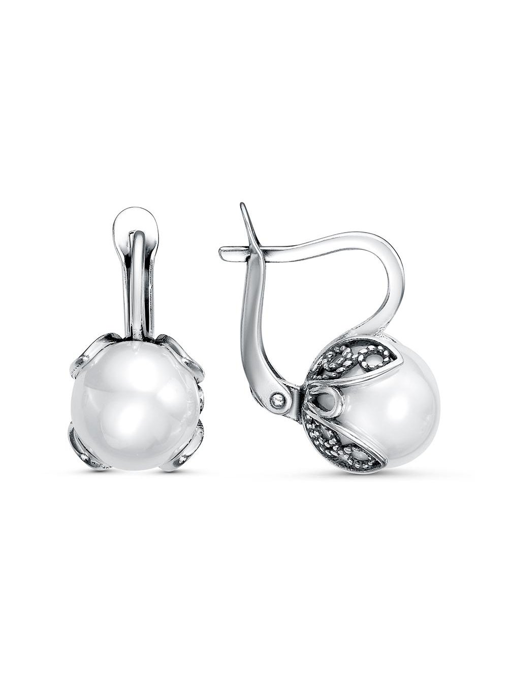 Серьги серебро 925 пробы, покрытие - оксидирование, вставка - имитация жемчуга