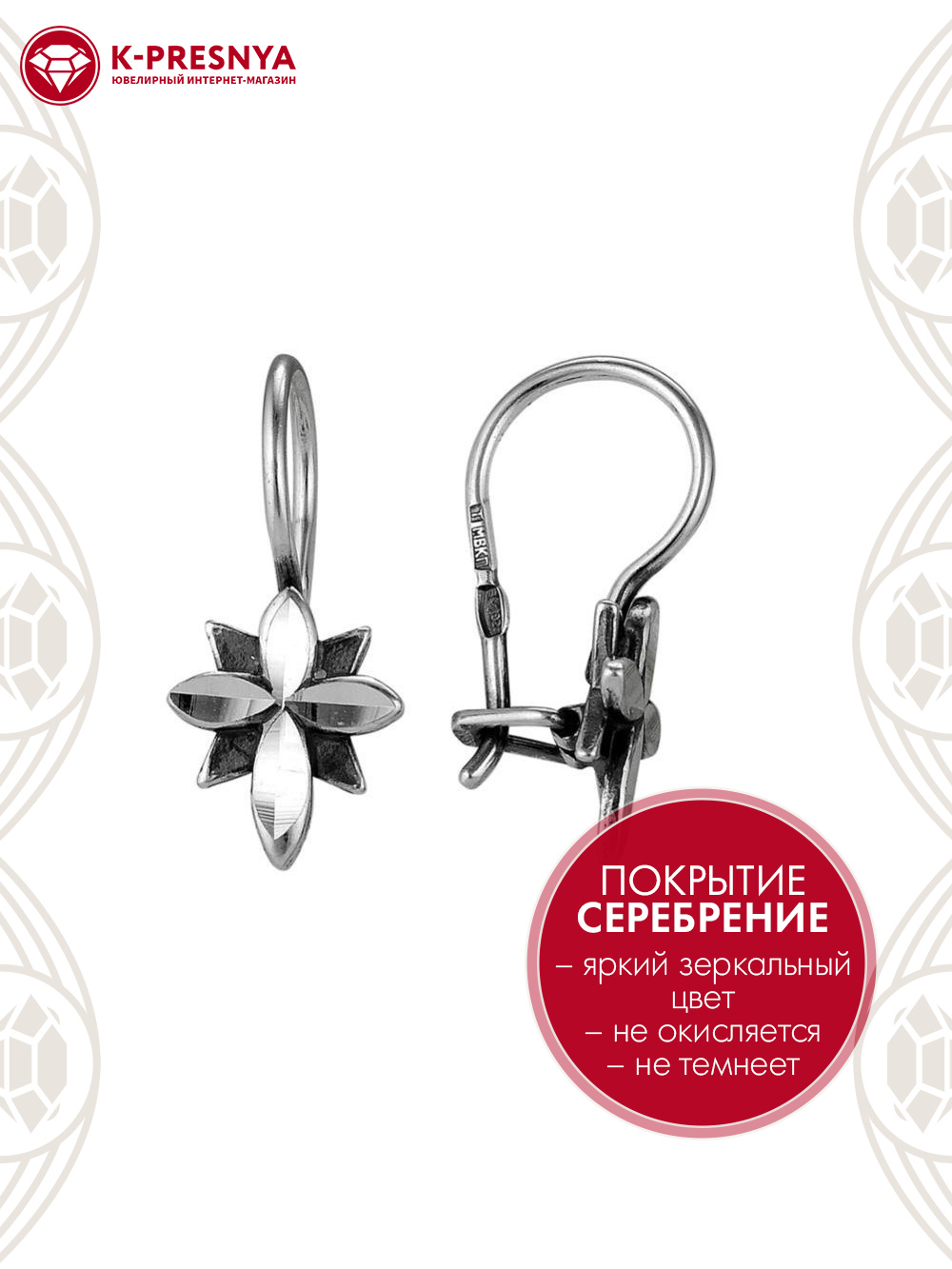 Серьги бижутерия, покрытие - серебрение с оксидированием, отделка - алмазная грань, без вставок