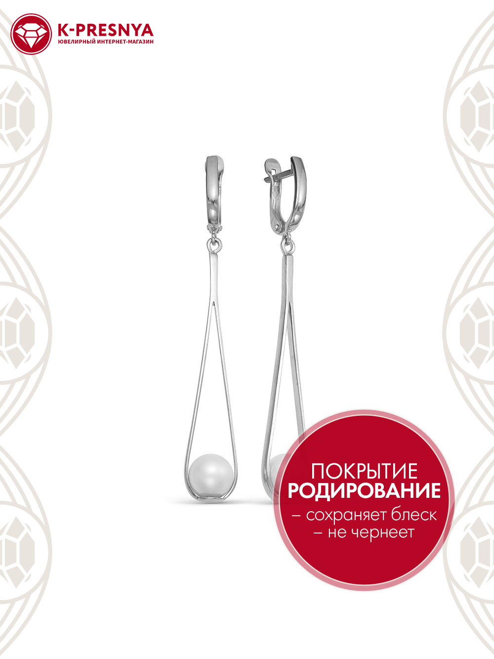 Серьги серебро 925 пробы, покрытие - родирование, вставка - имитация жемчуга