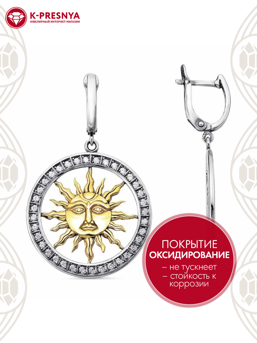 Серьги серебро 925 пробы, покрытие - оксидирование, выборочное золочение, вставка - фианит (недрагоценный камень)