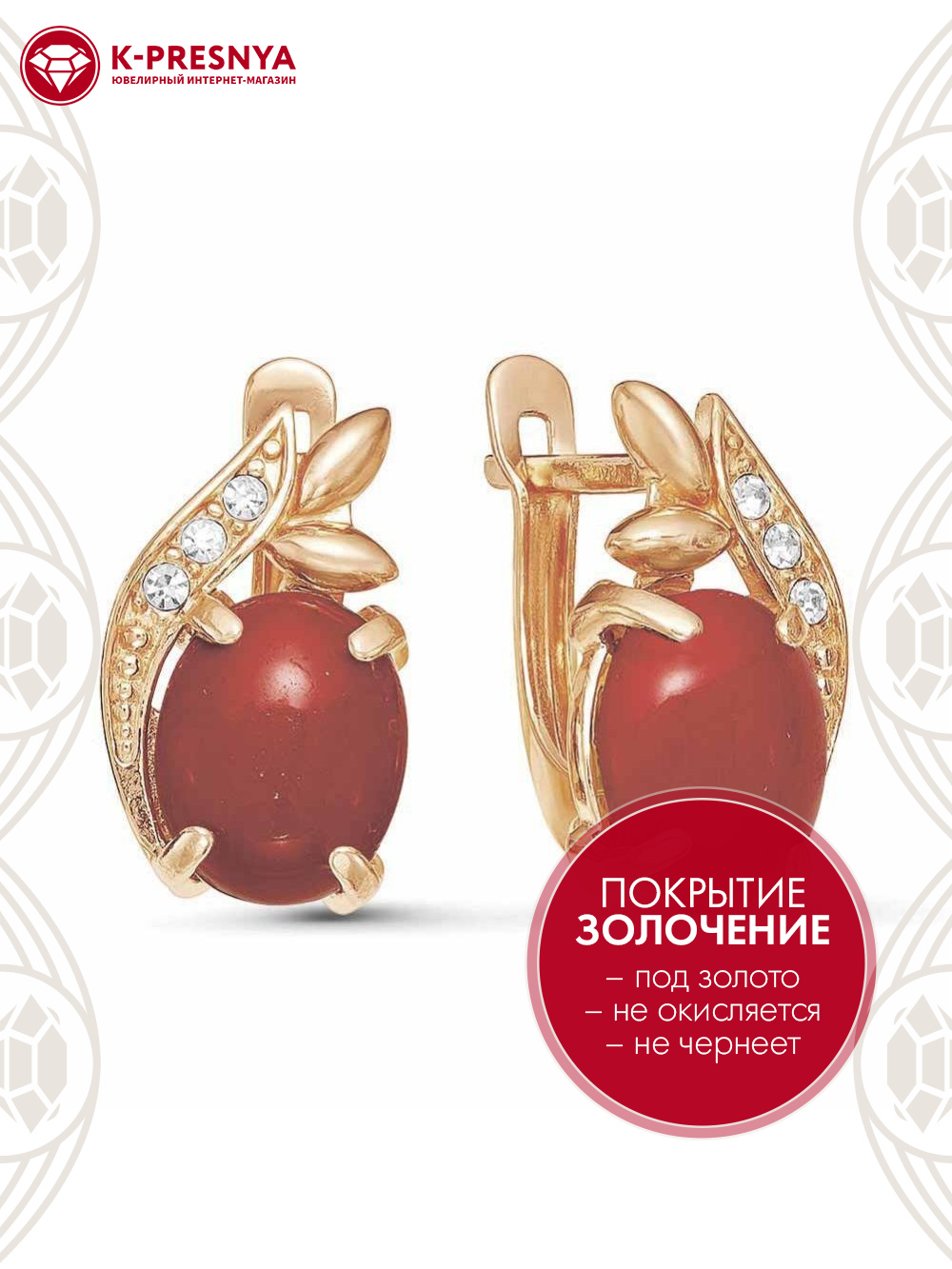 Серьги бижутерия, покрытие - золочение, вставка - искусственный коралл, стекло ювелирное preciosa