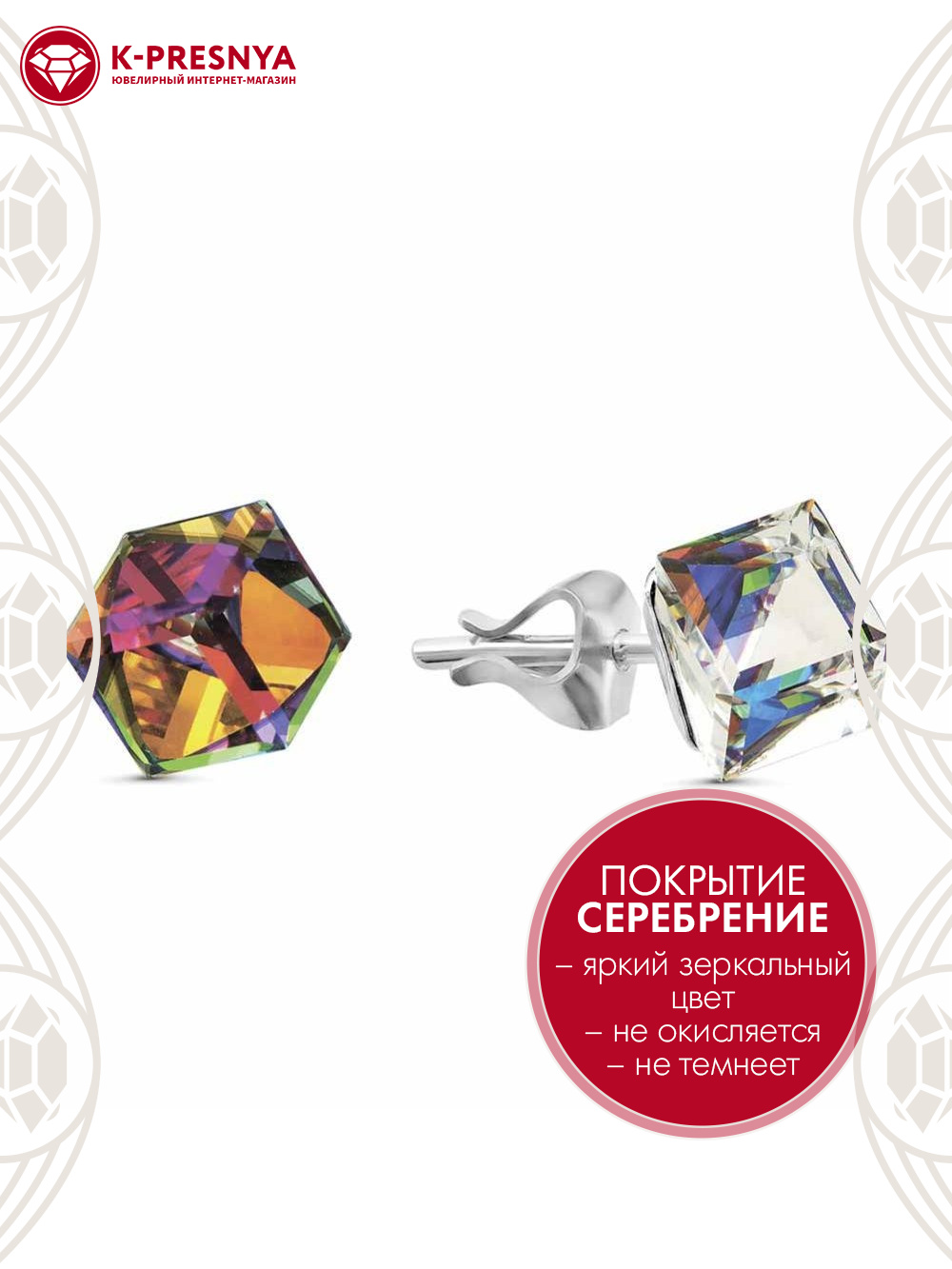 Серьги бижутерия, покрытие - серебрение, вставка - ювелирное стекло европейской огранки