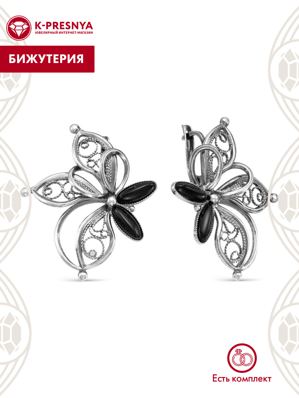 Серьги бижутерия, покрытие - серебрение с оксидированием, вставка - искусственный агат черный