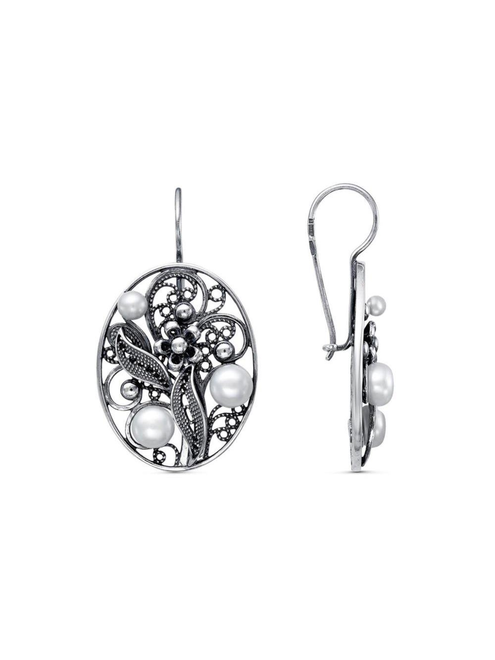 Серьги бижутерия, покрытие - серебрение с оксидированием, вставка - культивированный жемчуг