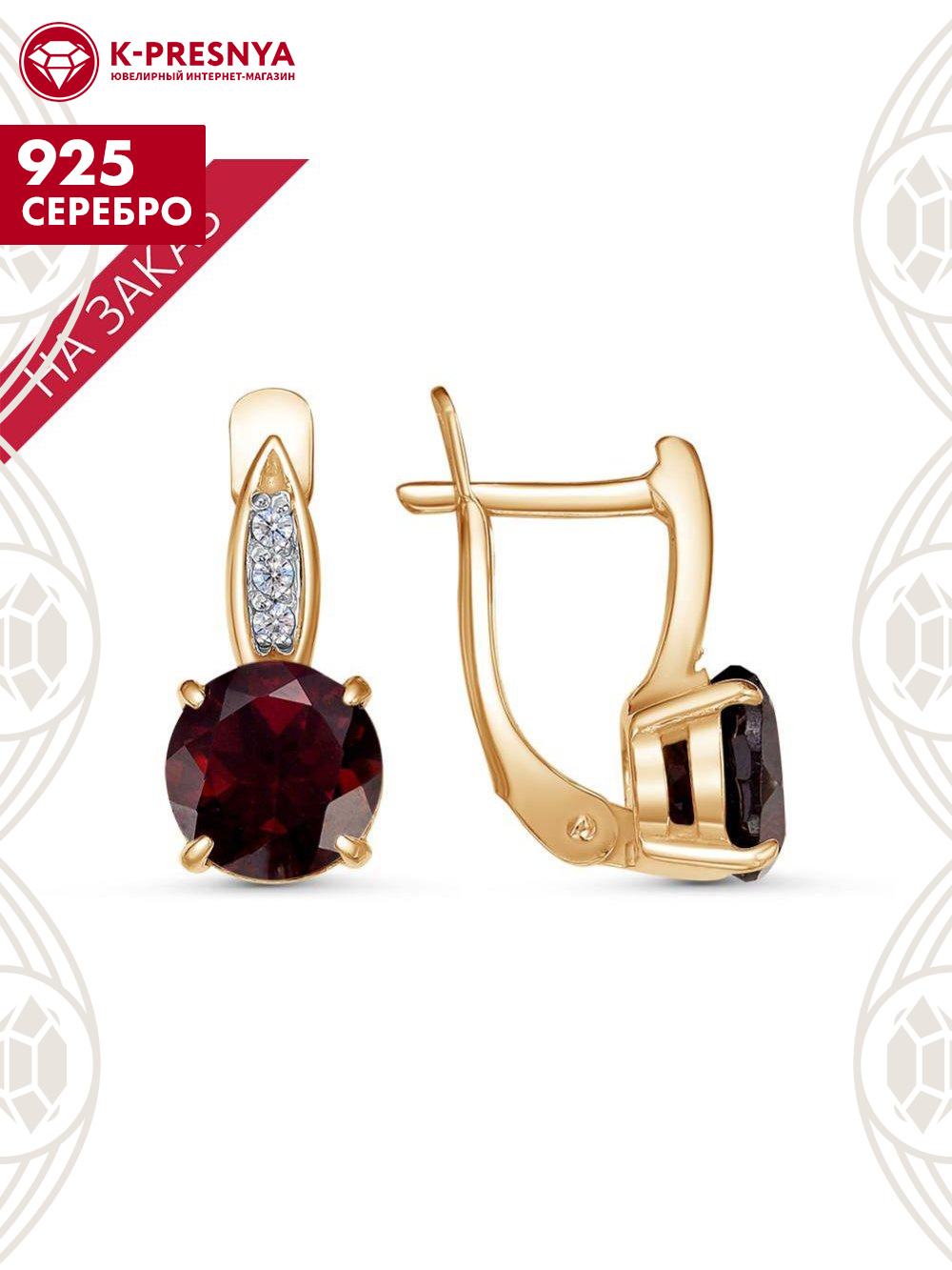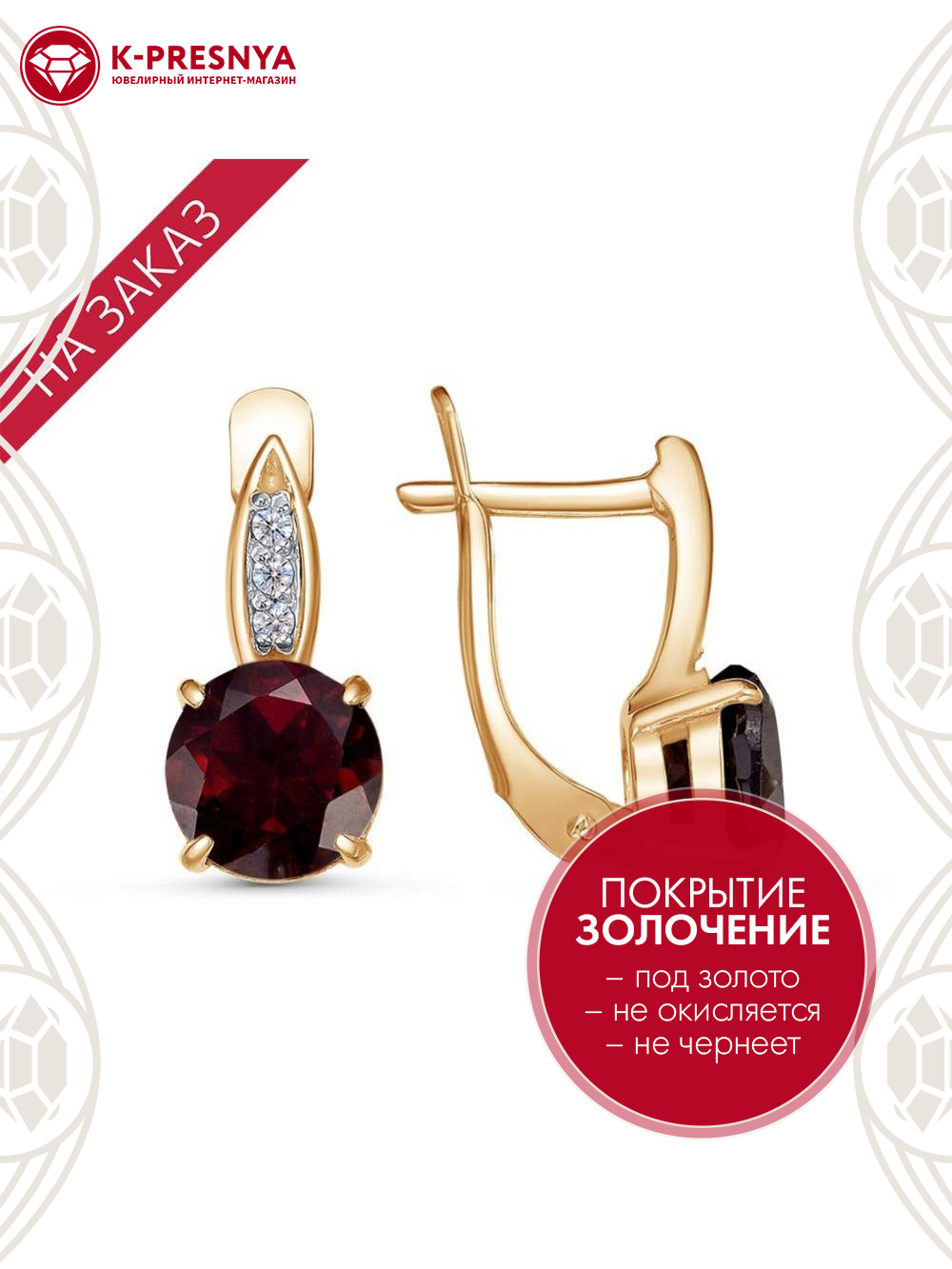 Гранат (полудраг. камень) Круг 2,1ct 8х5мм 2шт; Фианит (недраг. камень) Круг 1,5мм 6шт |