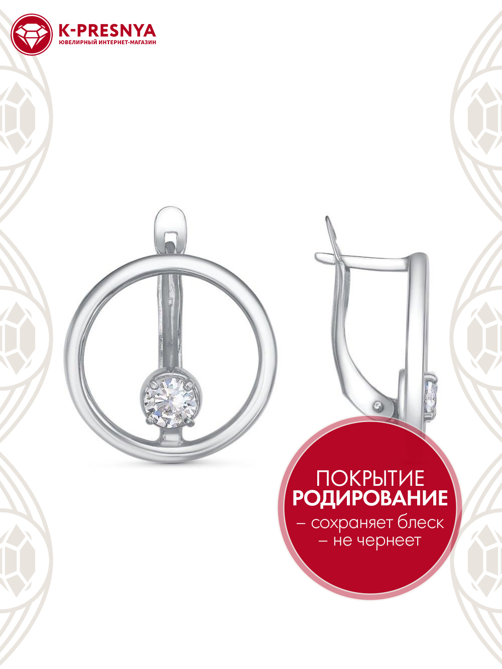 Серьги серебро 925 пробы, покрытие - родирование, вставка - фианит (недрагоценный камень)