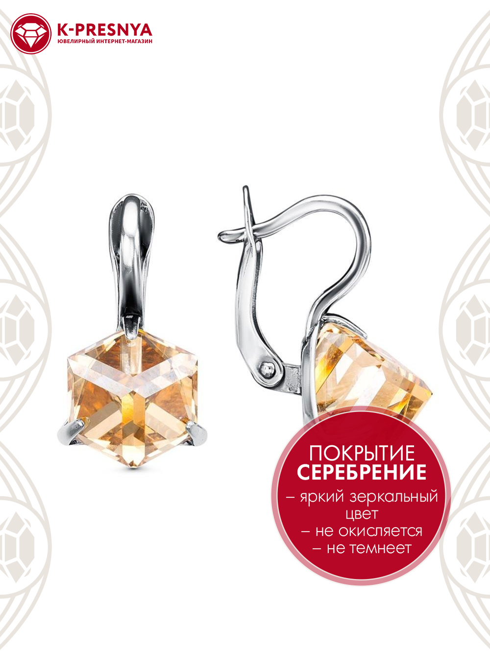 Серьги бижутерия, покрытие - серебрение с оксидированием, вставка - ювелирное стекло европейской огранки