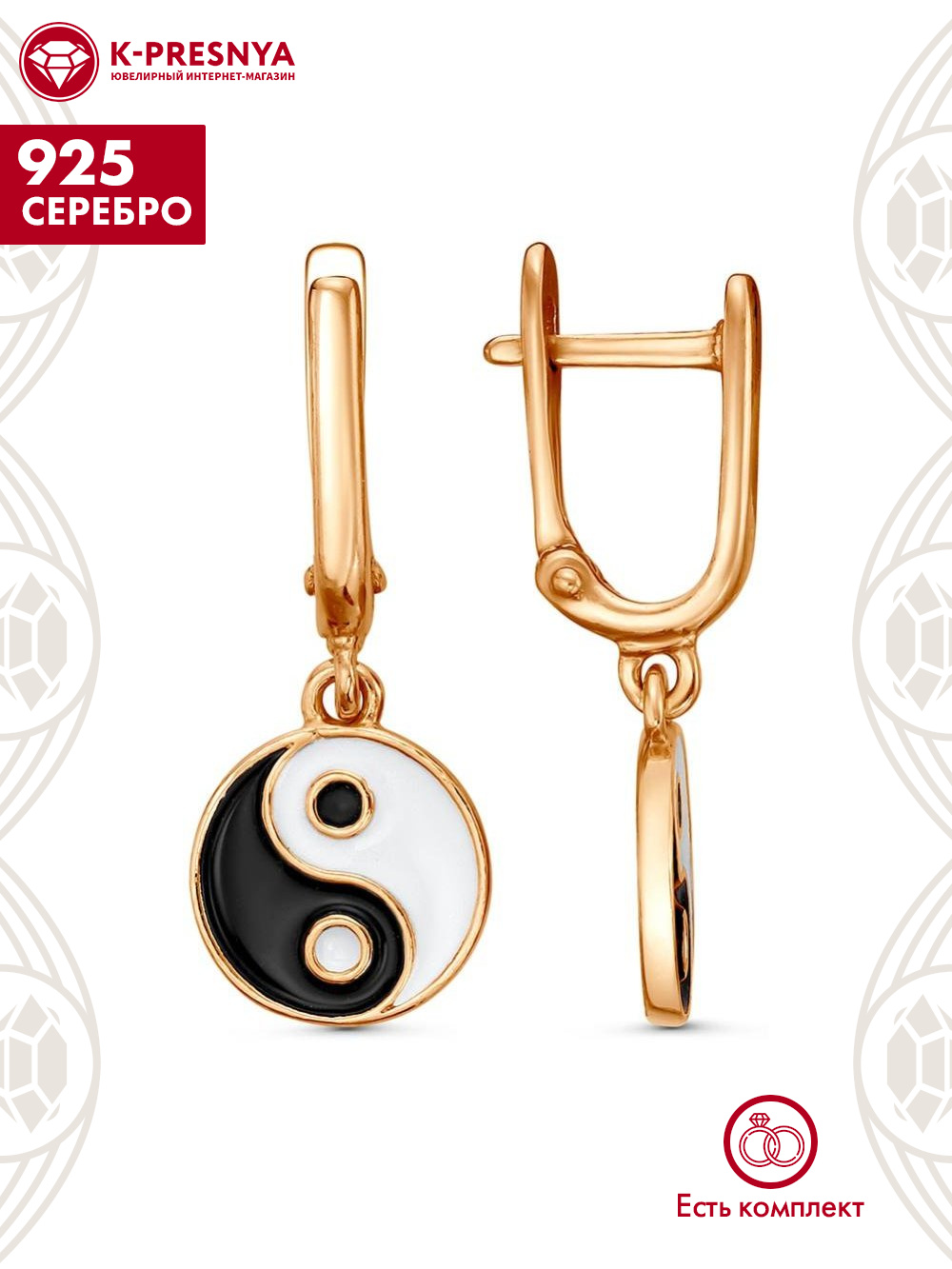 Серьги серебро 925 пробы, покрытие - золочение, отделка - эмаль, без вставок
