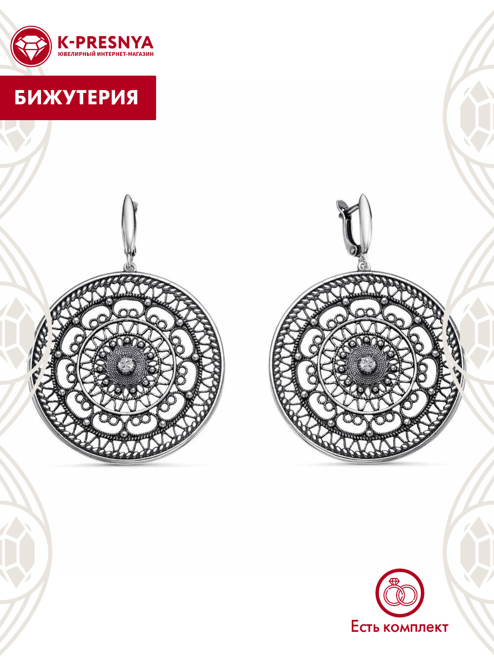 Серьги бижутерия, покрытие - серебрение с оксидированием, вставка - фианит (недрагоценный камень)