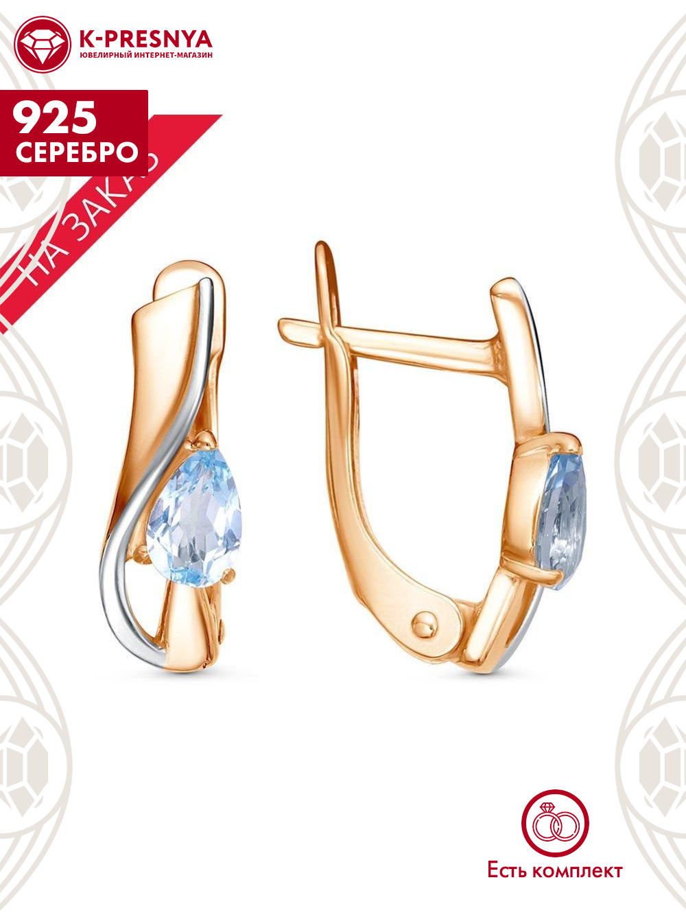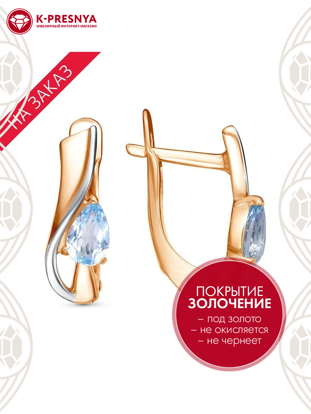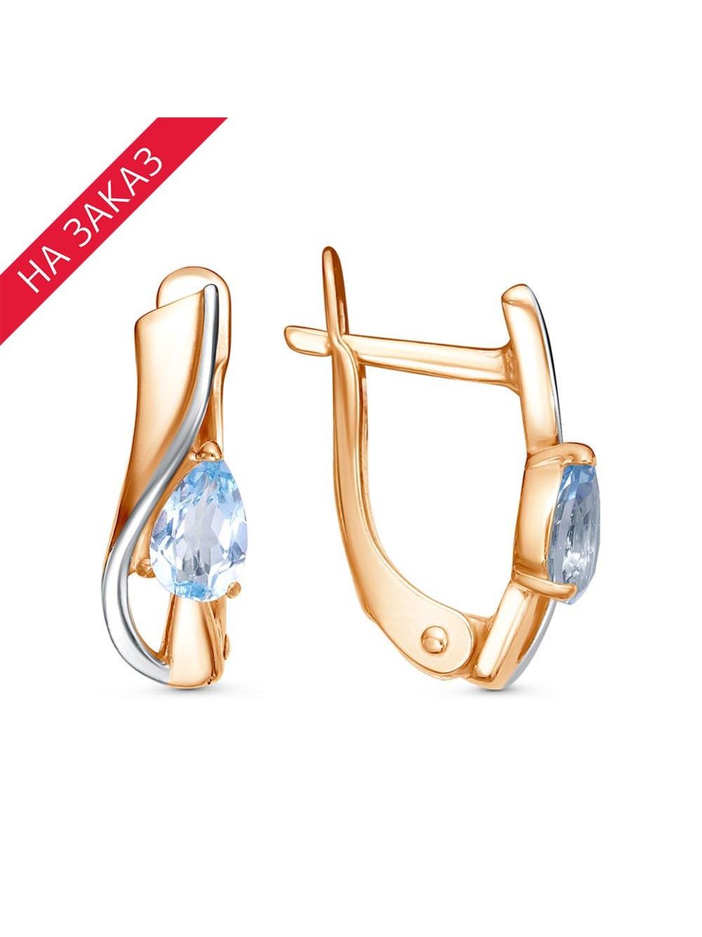 Серьги серебро 925 пробы, покрытие - золочение, выборочное родирование, вставка - голубой топаз (полудрагоценный камень)