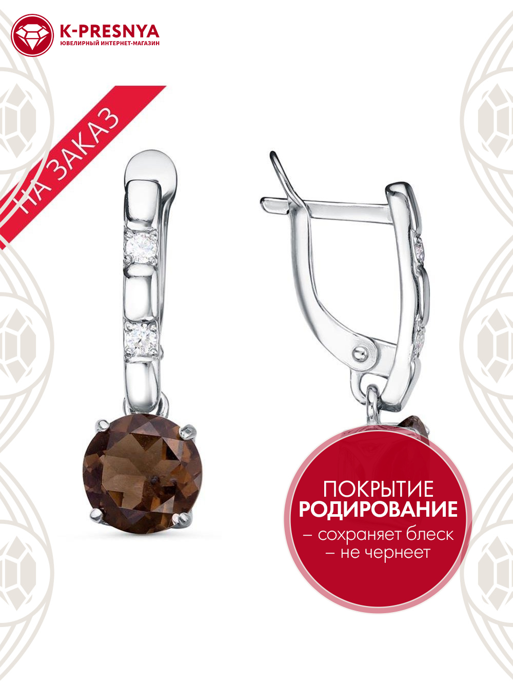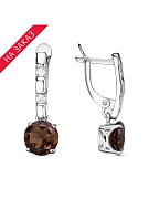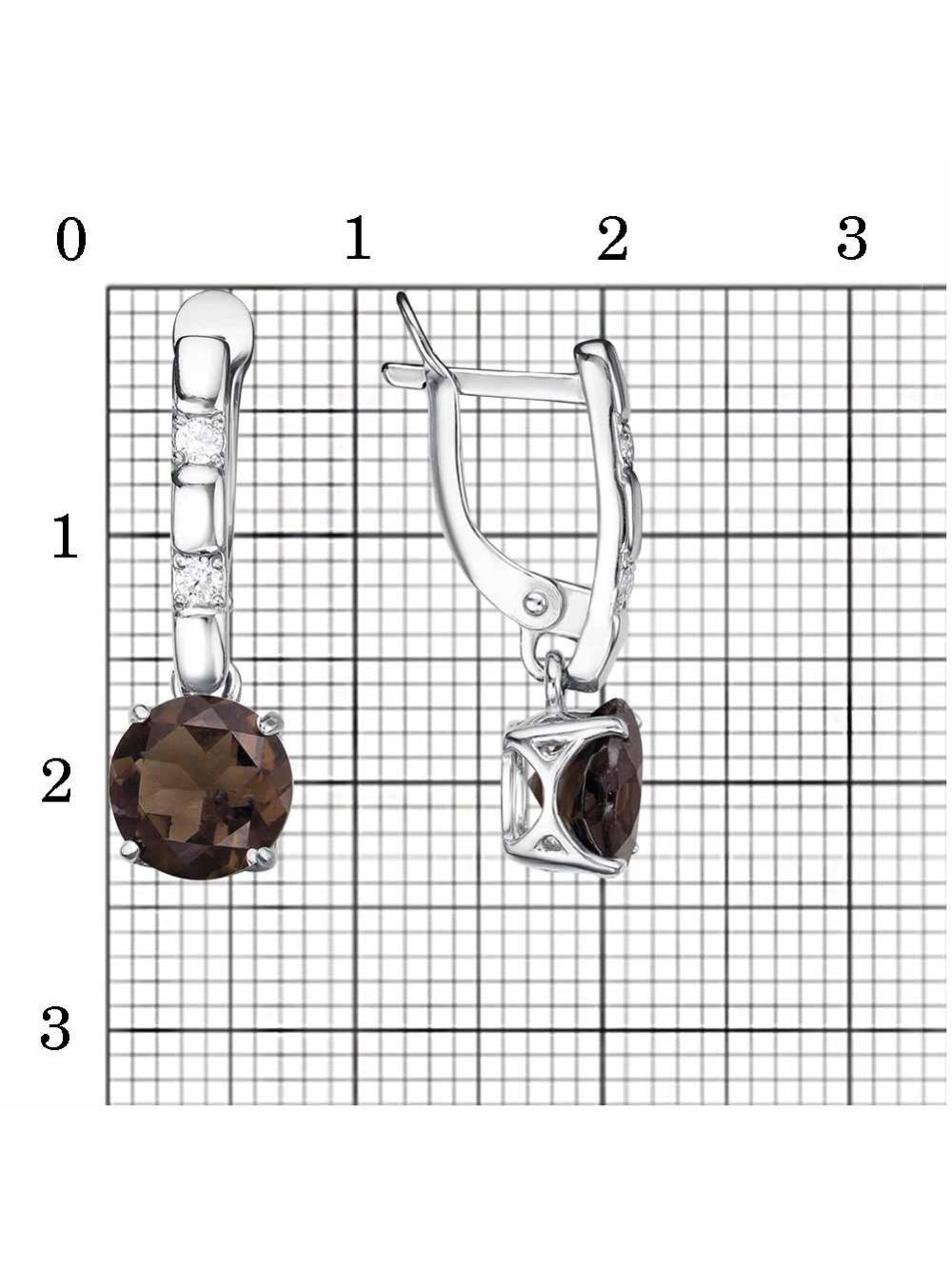 Серьги серебро 925 пробы, покрытие - родирование, вставка - дымчатый кварц, фианит (недрагоценный камень)