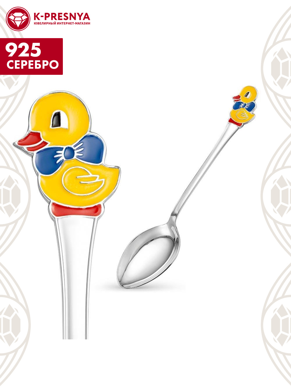 Ложка чайная "уточка" серебро 925 пробы, без покрытия, отделка - эмаль, без вставок