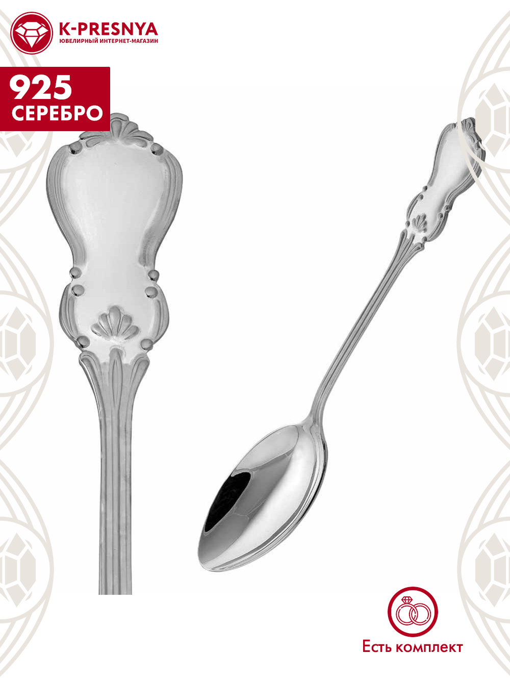 Аккуратная и удобная ложка выполнена из серебра 925°. Изысканный дизайн, с красивым узором на черенке, идеально подойдет для вкусного десерта.