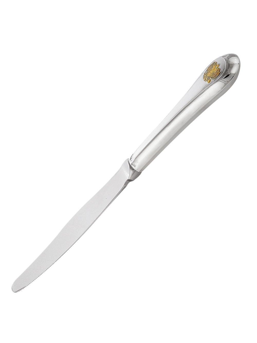 Идеально гладкий нож с отполированной поверхностью и плавно закругленным лаконичным лезвием. Ручка ножа выполнена из серебра 925°. На ней расположен позолоченный двуглавый орел, который символизирует единство и суверенитет России. Лезвие изготовлено из высокопрочной нержавеющей стали.