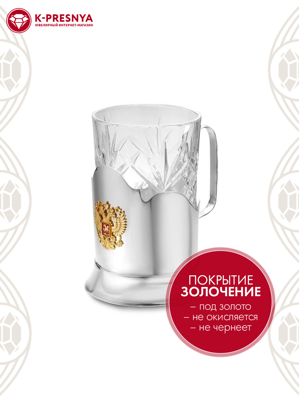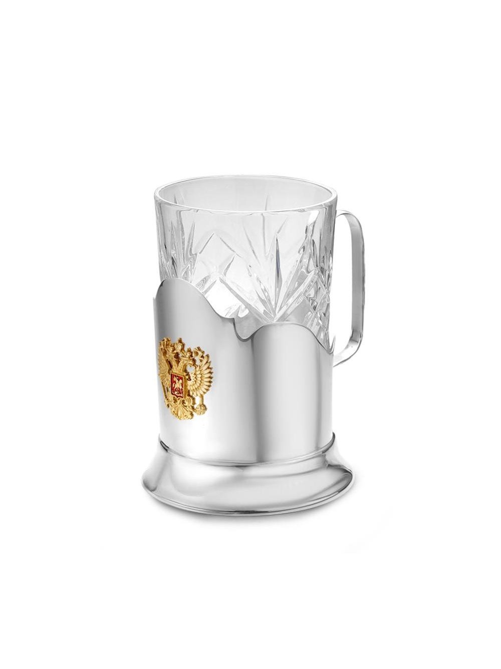 Подстаканник выполнен из благородного металла. На нем расположен позолоченный двуглавый орел, который символизирует единство и суверенитет России. На его груди находится красный щит, декорированный итальянской красной эмалью, в центре которого расположен серебряный всадник.