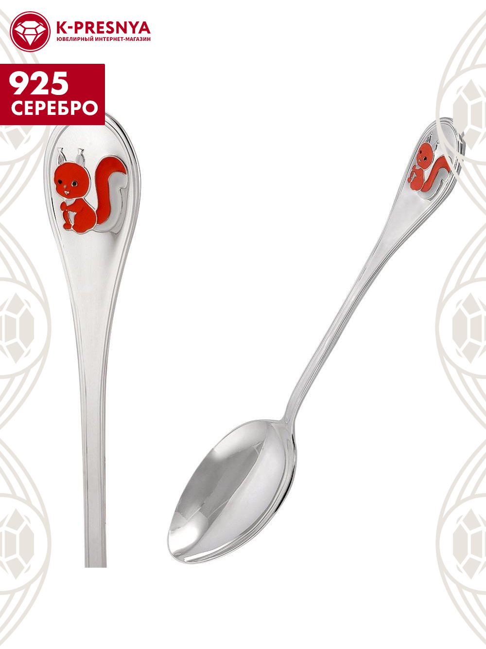 Ложка чайная "белочка" серебро 925 пробы, без покрытия, отделка - эмаль, без вставок
